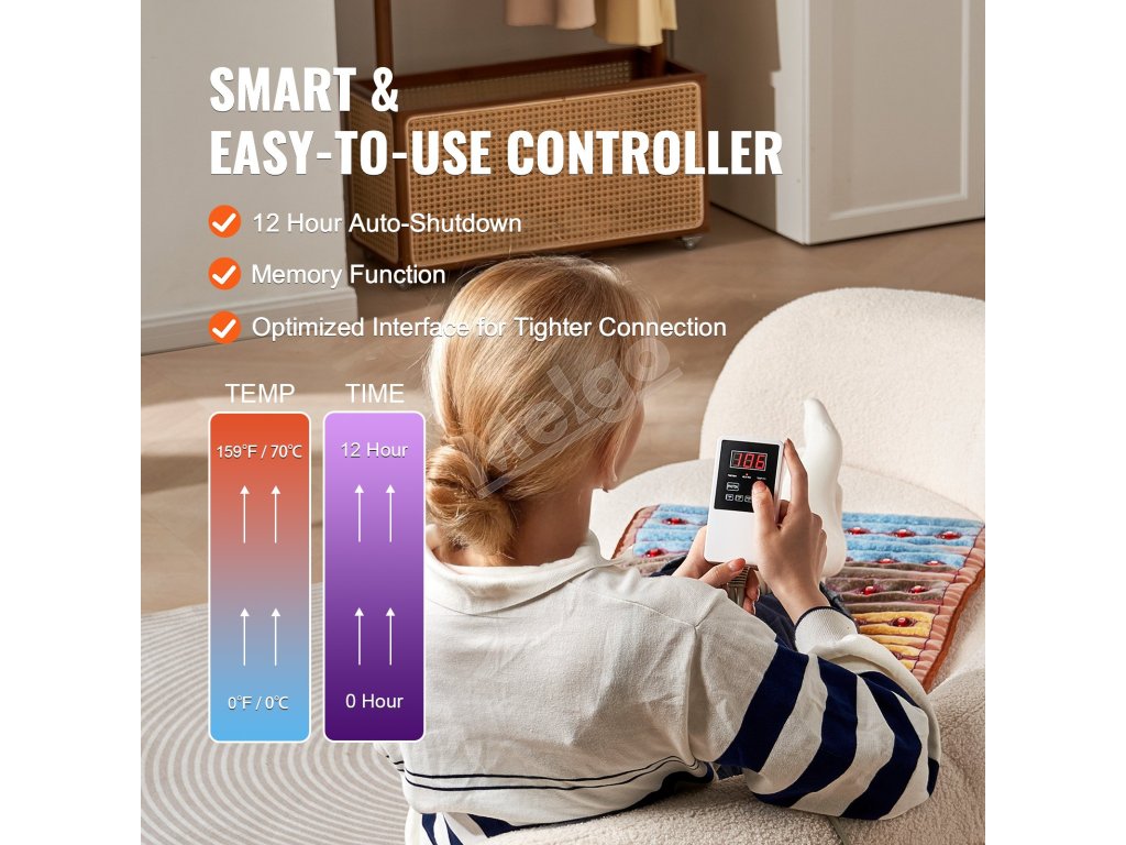 Pomocou inteligentného ovládača si môžete nastaviť teplotu od 103°F do 159°F. Je vybavená aj pamäťovou funkciou, ktorá si pamätá vaše posledné nastavenia, časovačom s nastavením 0 - 12 hodín spolu s funkciou automatického vypnutia, ktorá zabraňuje nadmernému používaniu a zaručuje, že ju nikdy nezabudnete vypnúť.