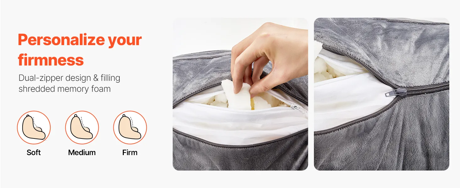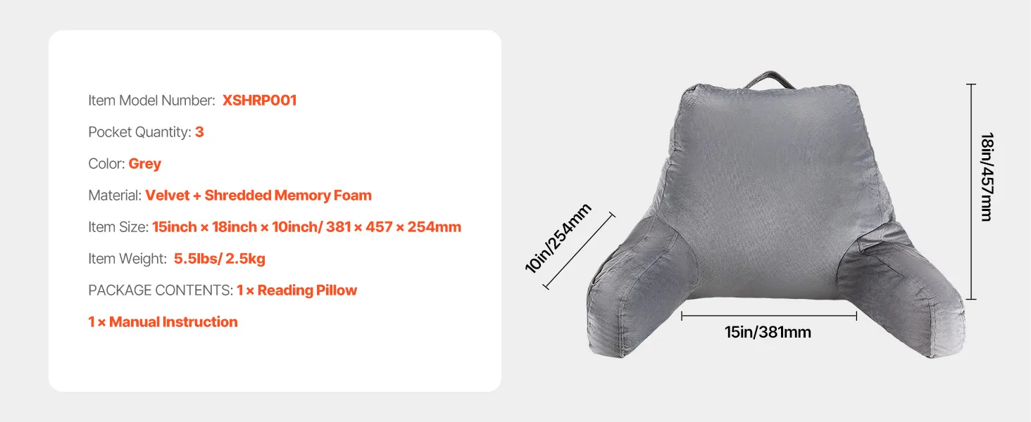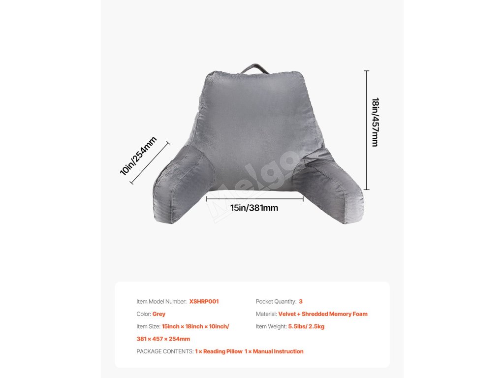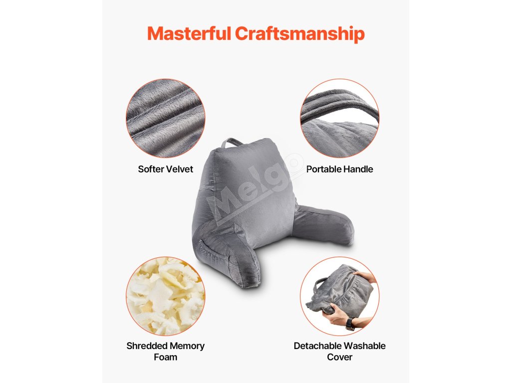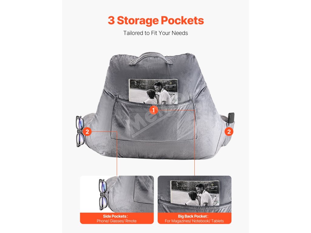 Čitateľský vankúš štandardný s drvenou pamäťovou penou, 3 vrecká, sivý