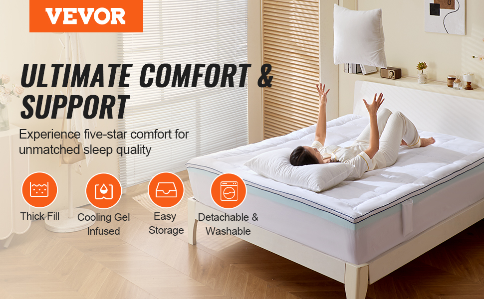 Náš topper na matrac je vyrobený z vysokokvalitnej plyšovej pamäťovej huby a tkaniny z polyesterových vlákien. Dokáže poskytnúť oporu pre telo. Špeciálne pridaný chladivý gélový materiál vám počas spánku zabezpečí chlad a pohodlie. Odnímateľný topper a konštrukcia vrecka na posteli vám uľahčia čistenie.