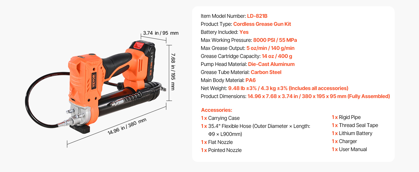 Bezdrôtová mazacia pištoľ 8000 PSI, 20V 2.0 Ah, 35.4-inch hadica, led