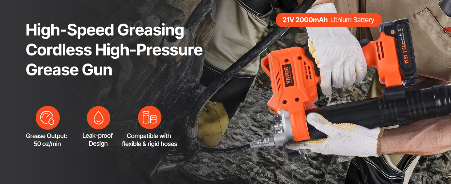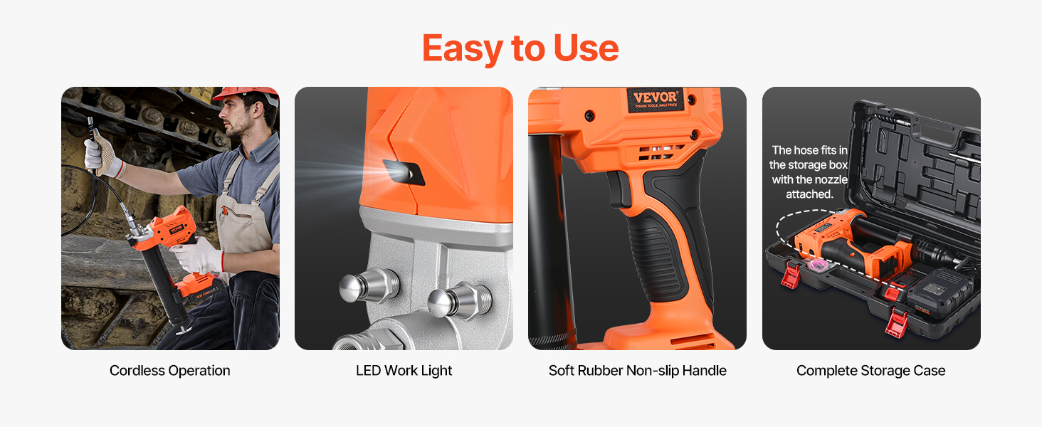Prejdite na bezdrôtové pripojenie a získajte úplnú slobodu! Zabudované LED svetlo elektrickej mazacej pištole zabezpečuje jas v tmavých pracovných priestoroch. Mäkká gumová rukoväť zaručuje pohodlnú manipuláciu, zatiaľ čo kompaktný úložný kufor umožňuje bezproblémovú prepravu a skladovanie.