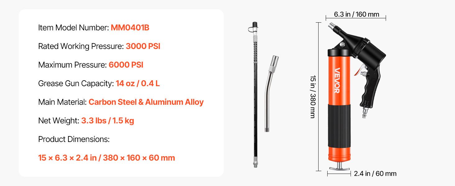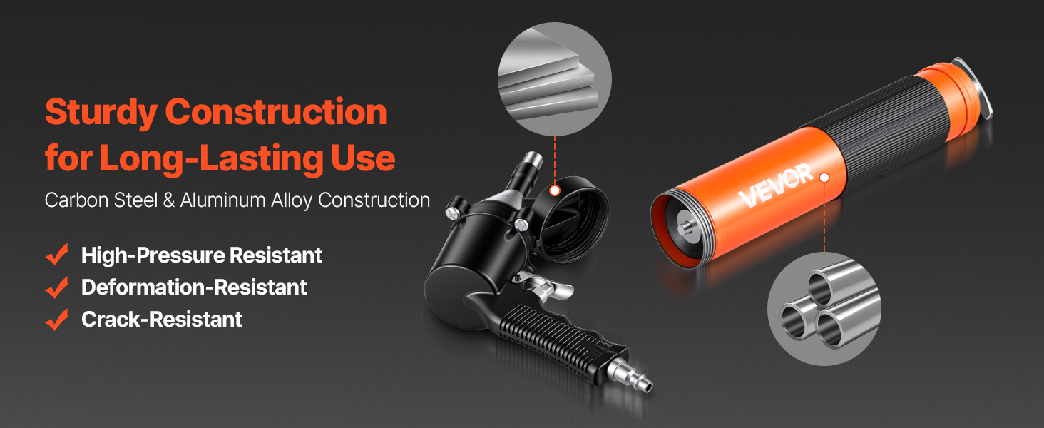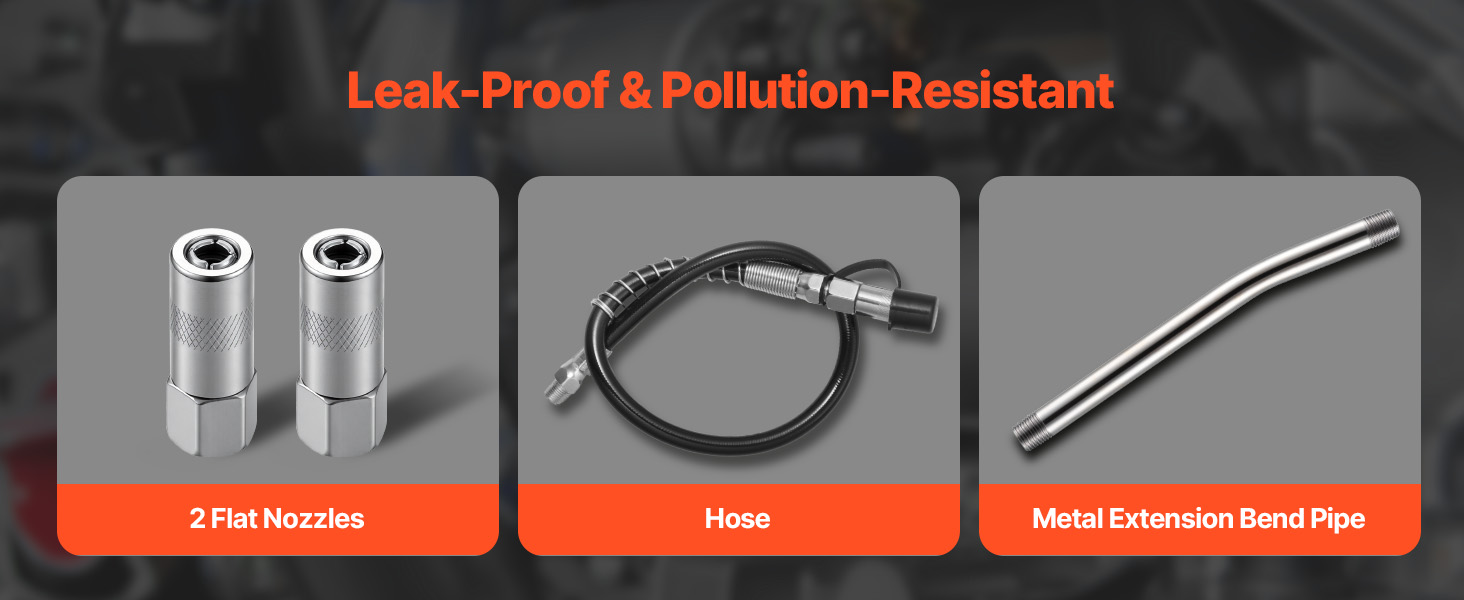 Táto pneumatická mazacia pištoľ sa dodáva s 2 plochými tryskami, ohybnou rúrkou a 18-palcovou hadicou - je vhodná na mazanie všetkých zariadení, od automobilov a poľnohospodárskych strojov až po bicykle.