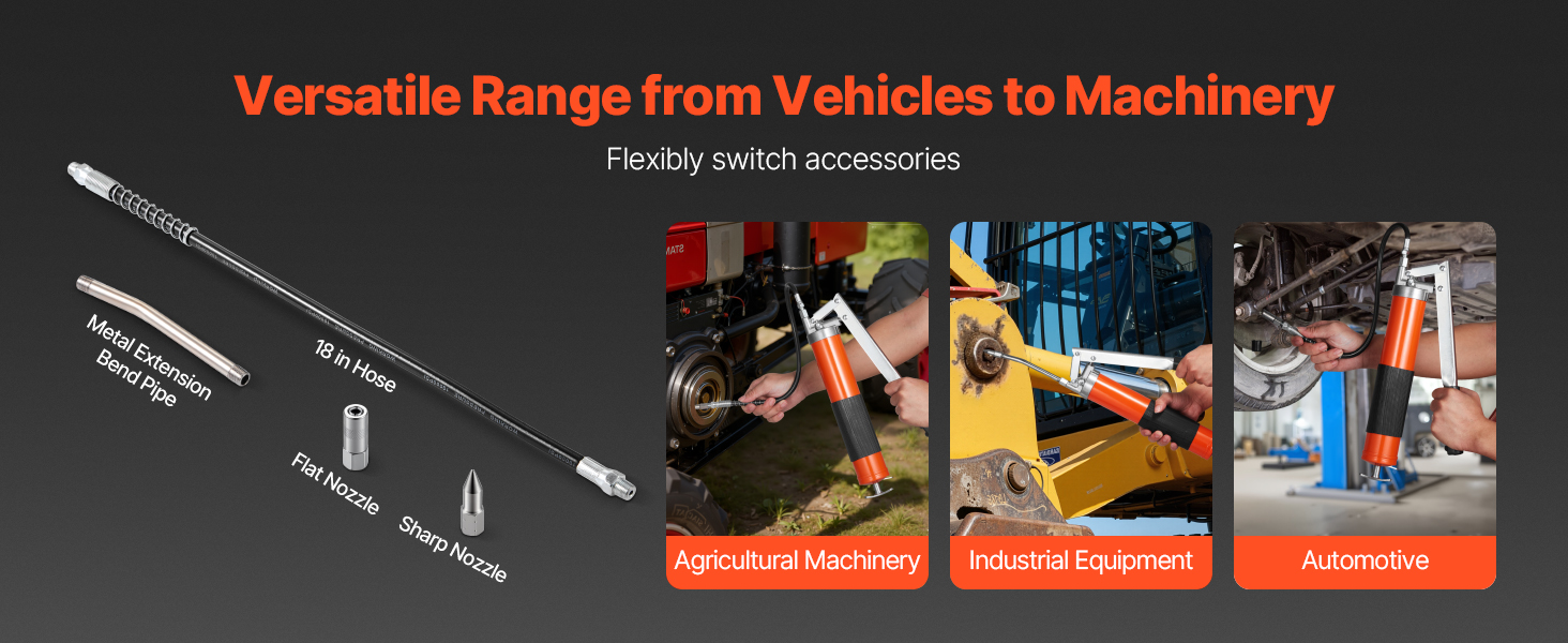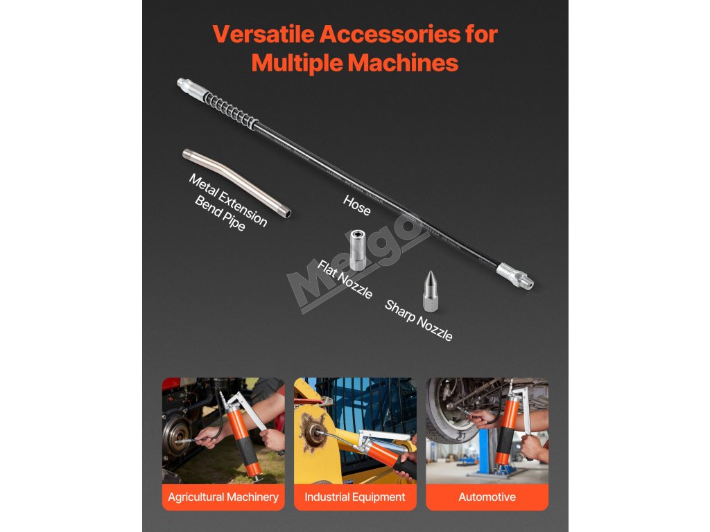 Táto pištoľová mazacia pištoľ sa dodáva s ostrou tryskou, plochou tryskou, ohybnou rúrkou a 18-palcovou hadicou - je vhodná na mazanie všetkých zariadení, od automobilov a poľnohospodárskych strojov až po bicykle.