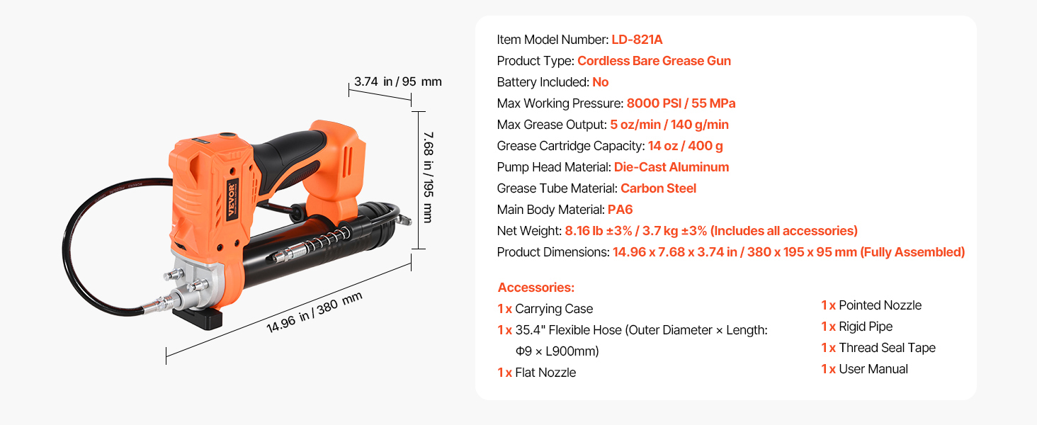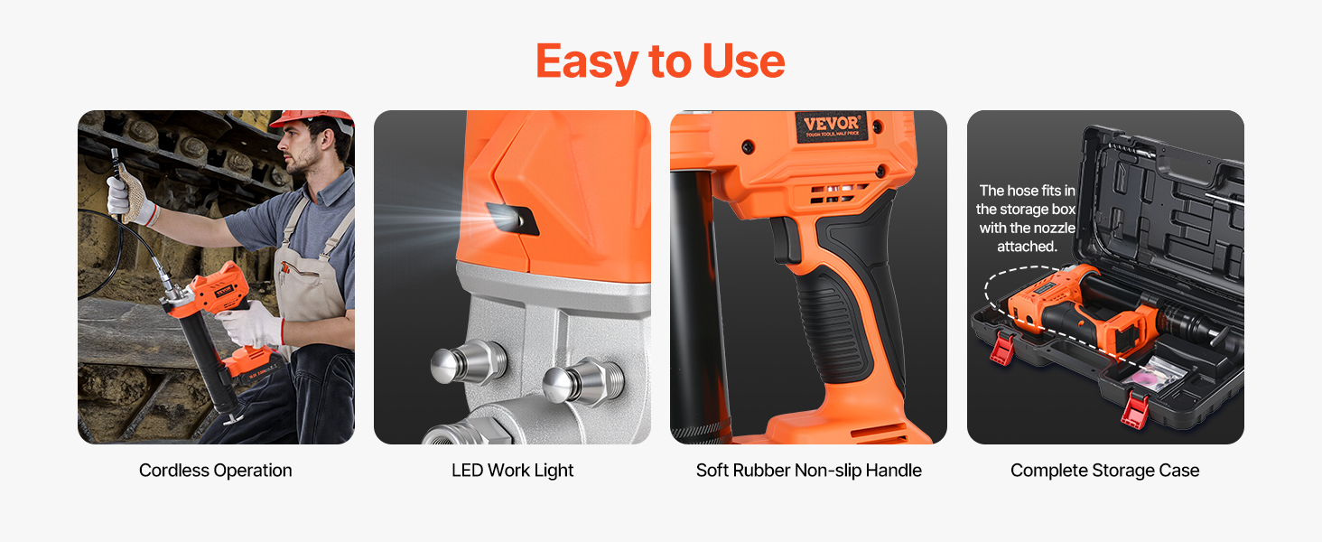 Prejdite na bezdrôtové pripojenie a získajte úplnú slobodu! Zabudované LED svetlo elektrickej mazacej pištole zabezpečuje jas v tmavých pracovných priestoroch. Mäkká gumová rukoväť zaručuje pohodlnú manipuláciu, zatiaľ čo kompaktný úložný kufor umožňuje bezproblémovú prepravu a skladovanie.