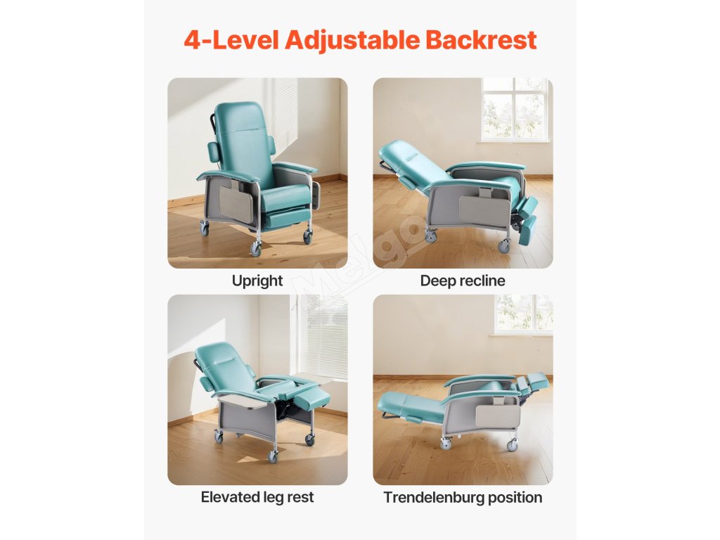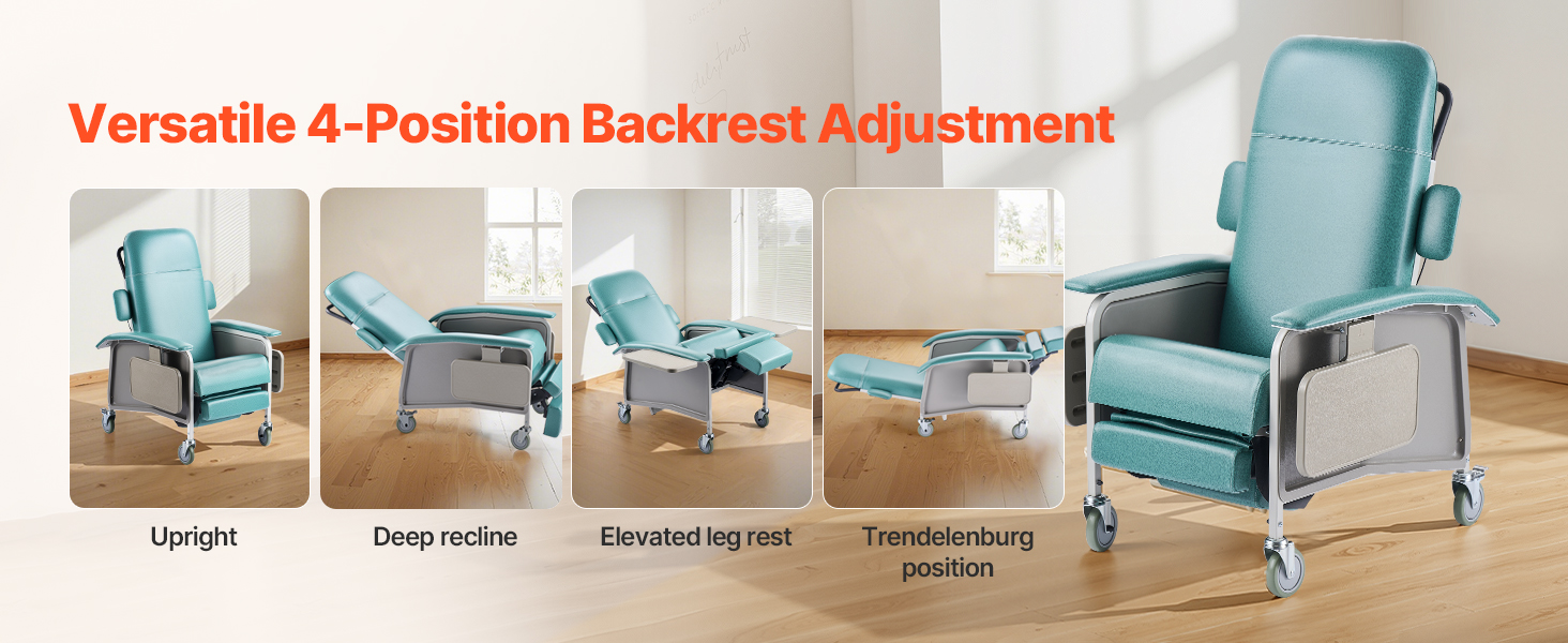 Toto polohovateľné geri kreslo je navrhnuté so 4 nastaviteľnými polohami, ktoré spĺňajú rôzne potreby. Nastavenie do vzpriamenej polohy na jedenie alebo konverzáciu, hlbokého ľahu na odpočinok a relaxáciu, zvýšenej polohy na nohy na zníženie tlaku na nohy a Trendelenburgovej polohy na zlepšenie krvného obehu.