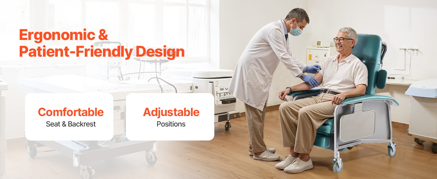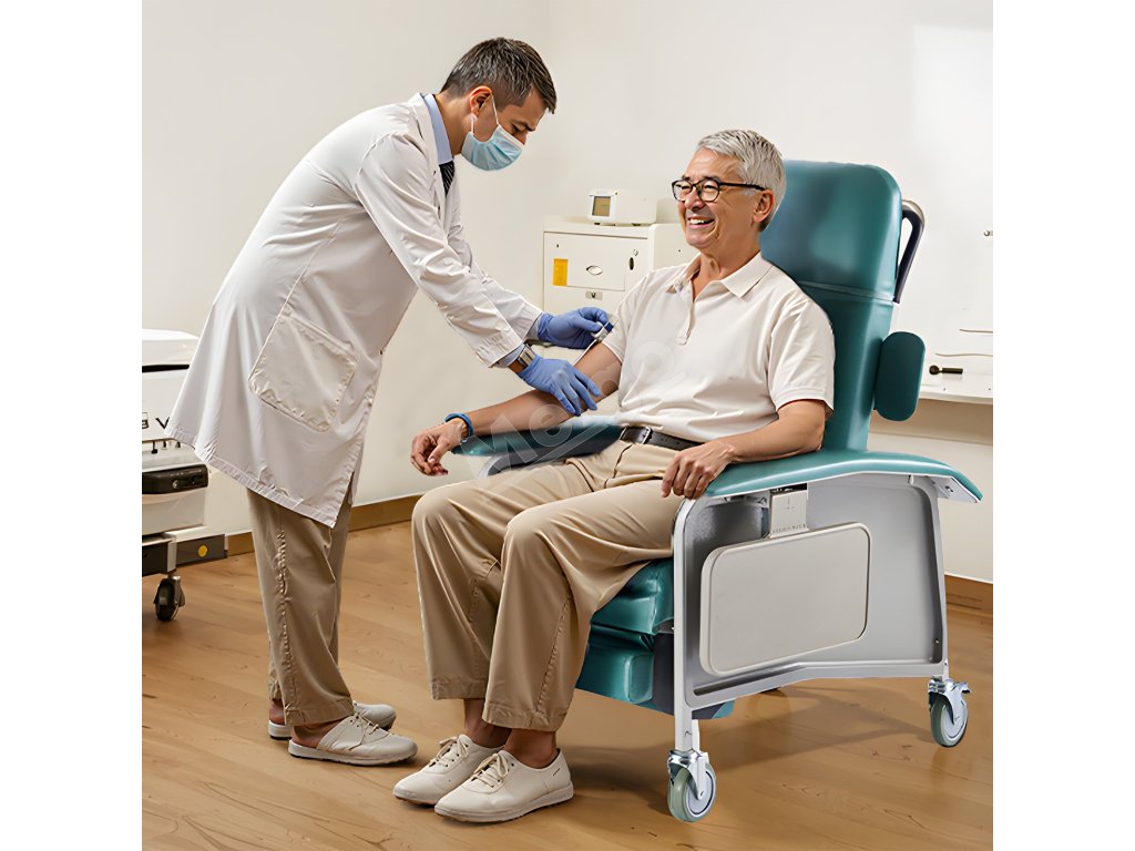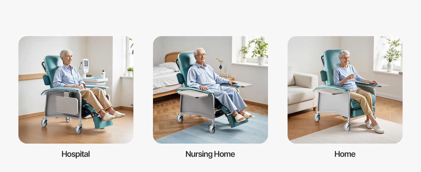 Toto geriatrické polohovateľné kreslo, ktoré je ideálne na použitie v nemocniciach, rehabilitačných centrách, domovoch dôchodcov a v domácej starostlivosti, poskytuje spoľahlivé pohodlie a oporu v rôznych lekárskych prostrediach a prostrediach každodennej starostlivosti.