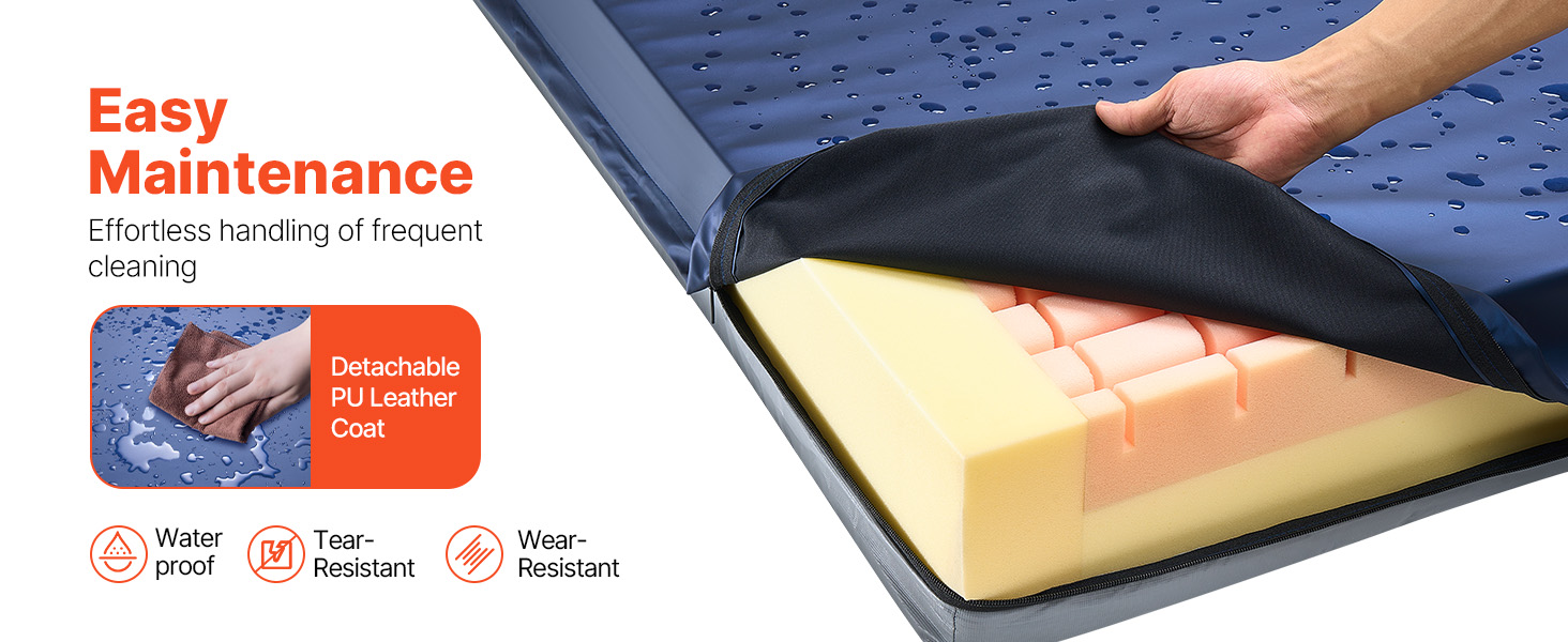 Penový zdravotný matrac sa dodáva so snímateľným poťahom z PU, ktorý je odolný proti opotrebovaniu. Je navrhnutý tak, aby blokoval rozliate tekutiny, odolával roztrhnutiu a zvládol časté čistenie bez toho, aby sa poškodil - je ideálny na každodenné používanie.