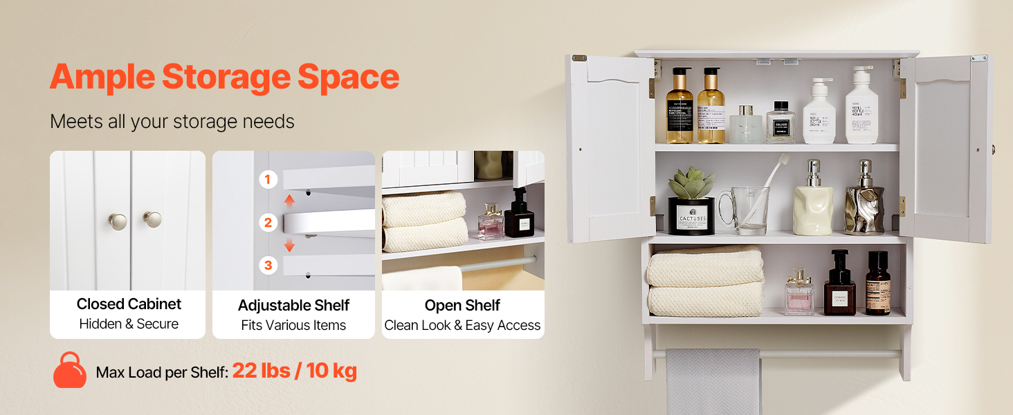 Uzavretá skrinka poskytuje skryté a bezpečné uloženie predmetov. Nastaviteľná polica závesnej kúpeľňovej skrinky sa dokáže flexibilne prispôsobiť rôznym typom predmetov a otvorená polica je prehľadná a krásna na prístup k predmetom dennej potreby. Je robustná a odolná.