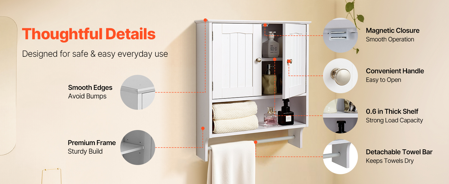 Naša závesná kúpeľňová skrinka má pevný a odolný rám z drevotrieskových dosiek s hladkým magnetickým zatváraním. Pohodlné úchyty a hladké hrany uľahčujú otváranie a zabraňujú nárazom. Odnímateľná tyč na uteráky udržiava čistotu s praktickosťou a ľudskosťou.