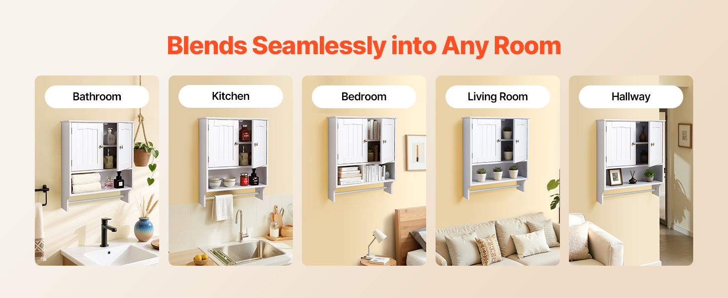 Táto multifunkčná kúpeľňová nástenná skrinka sa bez problémov začlení do kúpeľní, kuchýň, spální, obývacích izieb, chodieb a iných obytných priestorov. Flexibilne sa prispôsobí na ukladanie toaletných potrieb, kuchynských šanónov, organizovanie neporiadku v spálni alebo zdobenie stien obývacej izby.