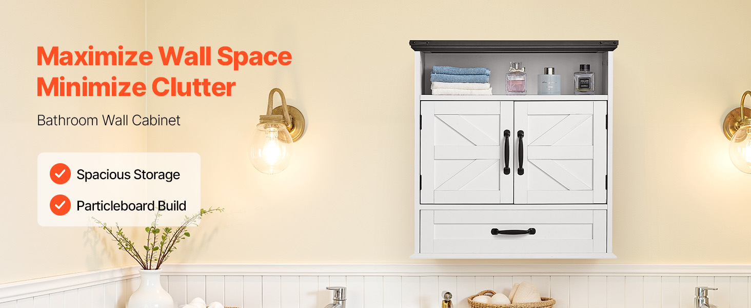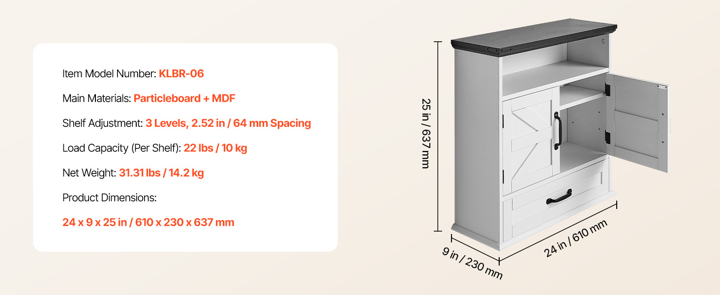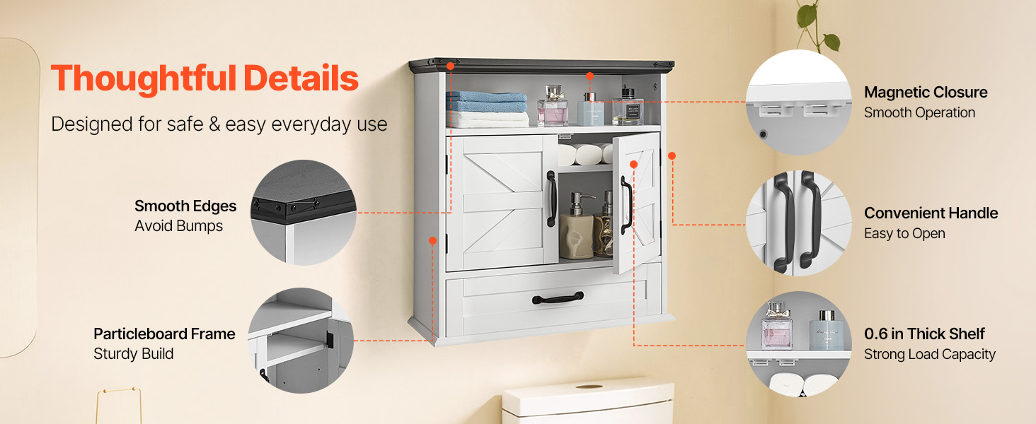 Naša závesná kúpeľňová skrinka má pevný a odolný rám z drevotrieskových dosiek s hladkým magnetickým zatváraním. Pohodlné úchyty a hladké hrany uľahčujú otváranie a zabraňujú nárazom. Polička s hrúbkou 0,6 palca poskytuje silnú nosnosť, zostáva dlhodobo pevná a atraktívna.
