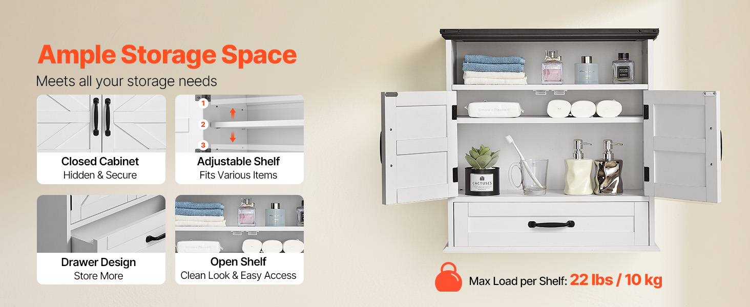 Uzavretá konštrukcia skrinky a zásuvky poskytuje skryté a bezpečné uloženie predmetov. Nastaviteľná polica závesnej kúpeľňovej skrinky sa dokáže flexibilne prispôsobiť rôznym typom predmetov a otvorená polica je prehľadná a krásna na prístup k predmetom dennej potreby. Je robustná a odolná.