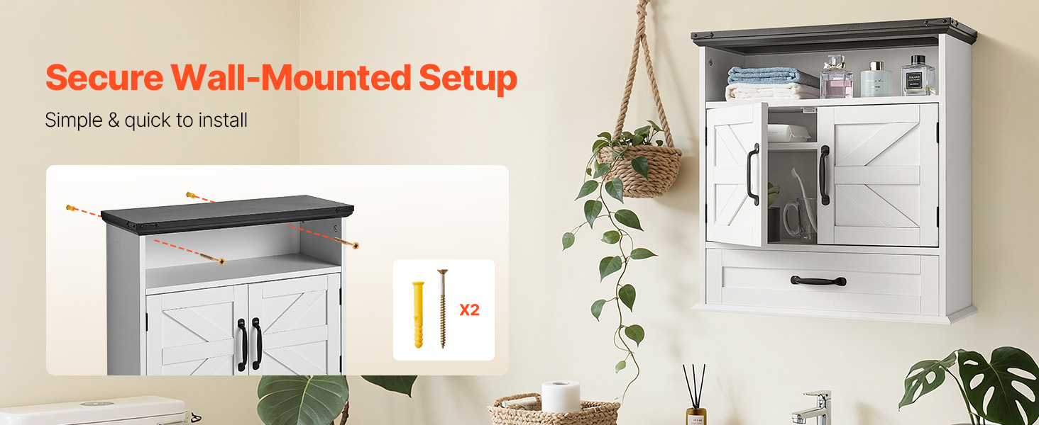 Táto nástenná kúpeľňová skrinka má bezpečnú a stabilnú montážnu konštrukciu, je doplnená podrobným návodom na použitie a kompletnou sadou náradia. Na jednoduchú inštaláciu nie sú potrebné žiadne zložité operácie. Skrinku môžete rýchlo namontovať na stenu, či už ide o začiatočníka alebo neprofesionála.