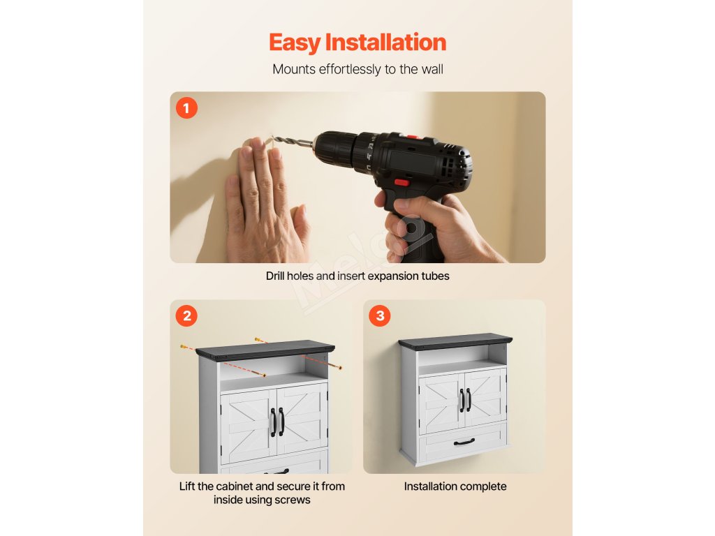 Táto nástenná kúpeľňová skrinka má bezpečnú a stabilnú montážnu konštrukciu, je doplnená podrobným návodom na použitie a kompletnou sadou náradia. Na jednoduchú inštaláciu nie sú potrebné žiadne zložité operácie. Skrinku môžete rýchlo namontovať na stenu, či už ide o začiatočníka alebo neprofesionála.