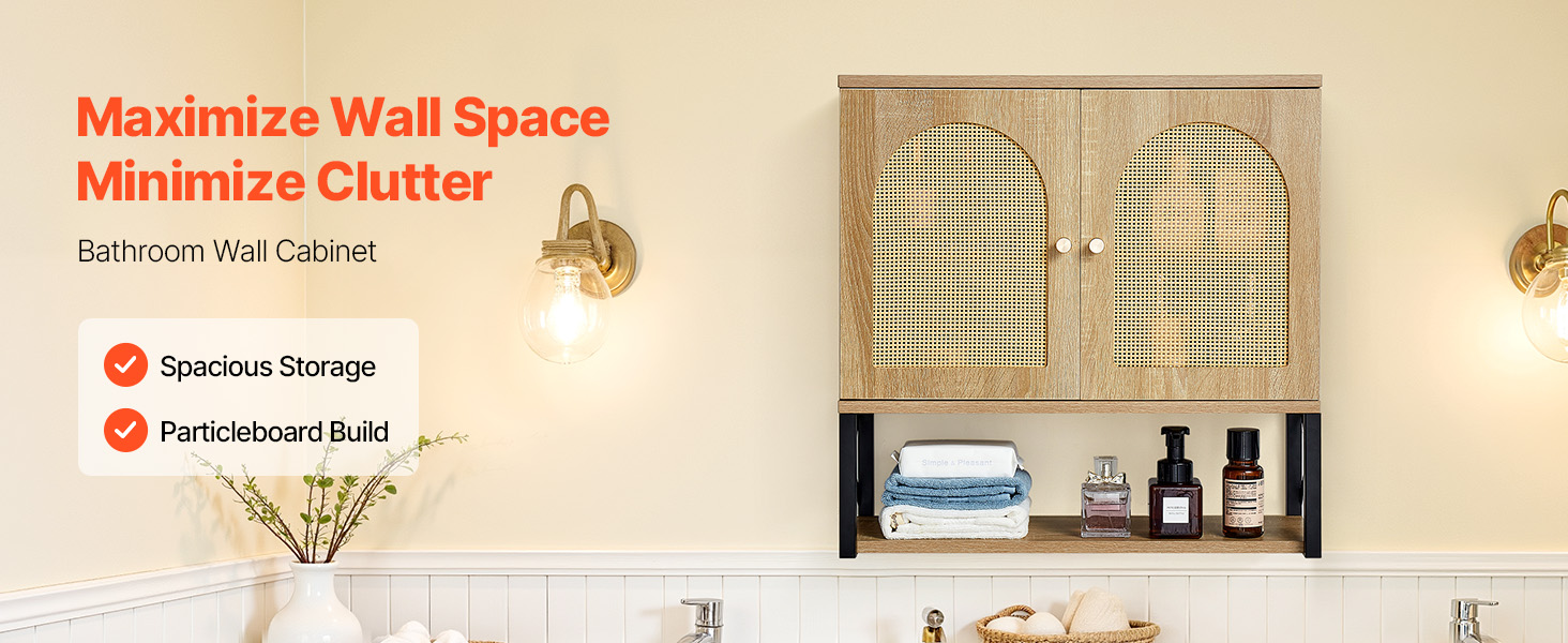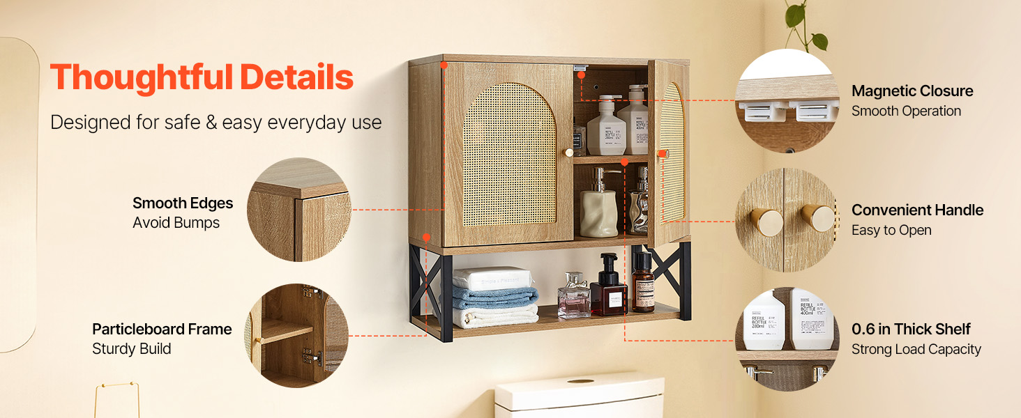 Naša závesná kúpeľňová skrinka má pevný a odolný rám z drevotrieskových dosiek s hladkým magnetickým zatváraním. Pohodlné úchyty a hladké hrany uľahčujú otváranie a zabraňujú nárazom. Polička s hrúbkou 0,6 palca poskytuje silnú nosnosť, zostáva dlhodobo pevná a atraktívna.