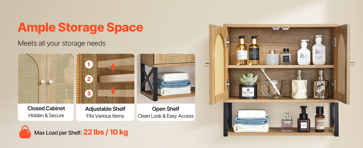 Uzavretá skrinka poskytuje skryté a bezpečné uloženie predmetov. Nastaviteľná polica závesnej kúpeľňovej skrinky sa dokáže flexibilne prispôsobiť rôznym typom predmetov a otvorená polica je prehľadná a krásna na prístup k predmetom dennej potreby. Je robustná a odolná.