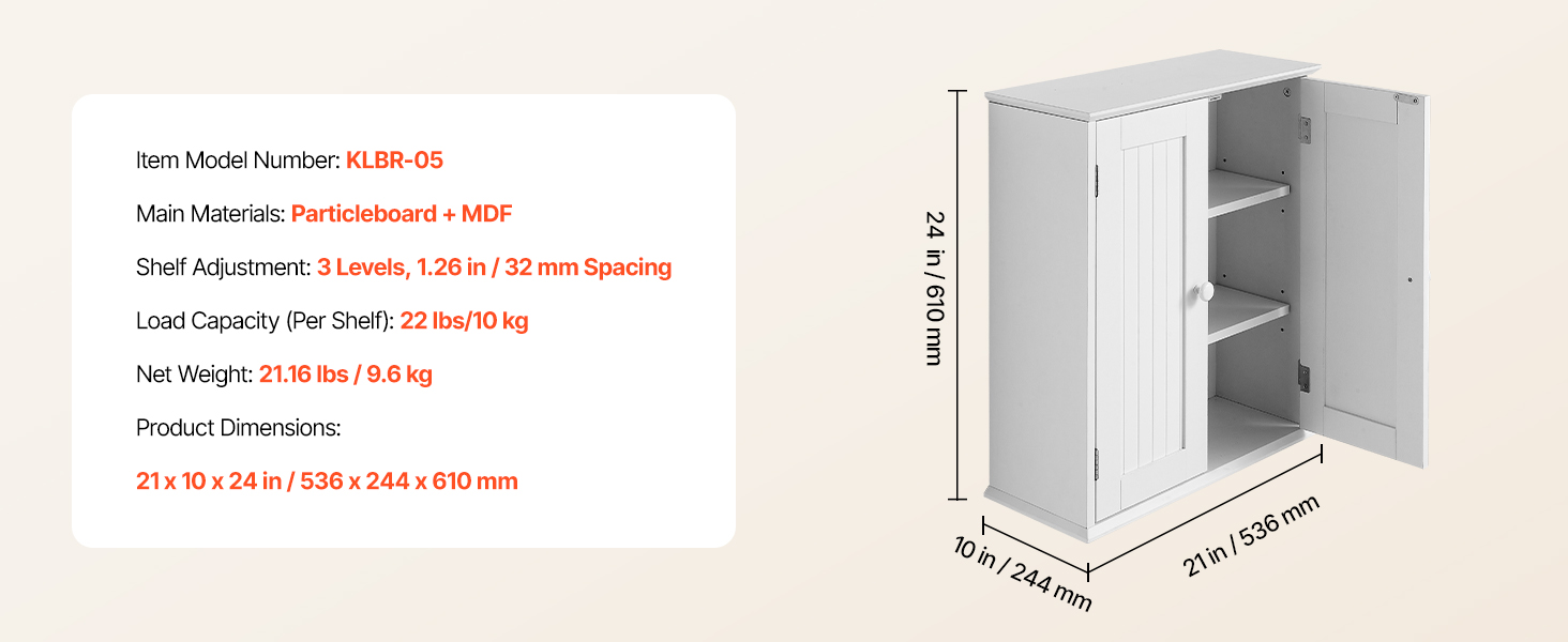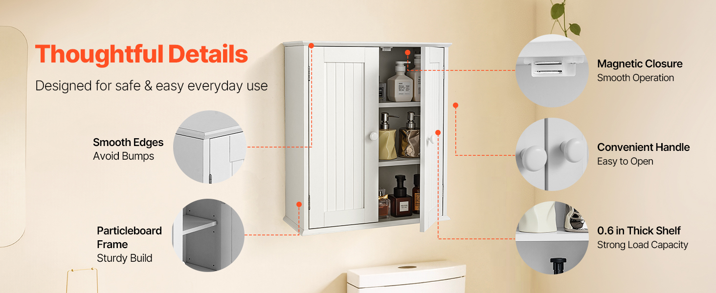 Naša závesná kúpeľňová skrinka má pevný a odolný rám z drevotrieskových dosiek s hladkým magnetickým zatváraním. Pohodlné úchyty a hladké hrany uľahčujú otváranie a zabraňujú nárazom. Polička s hrúbkou 0,6 palca poskytuje silnú nosnosť, zostáva dlhodobo pevná a atraktívna.