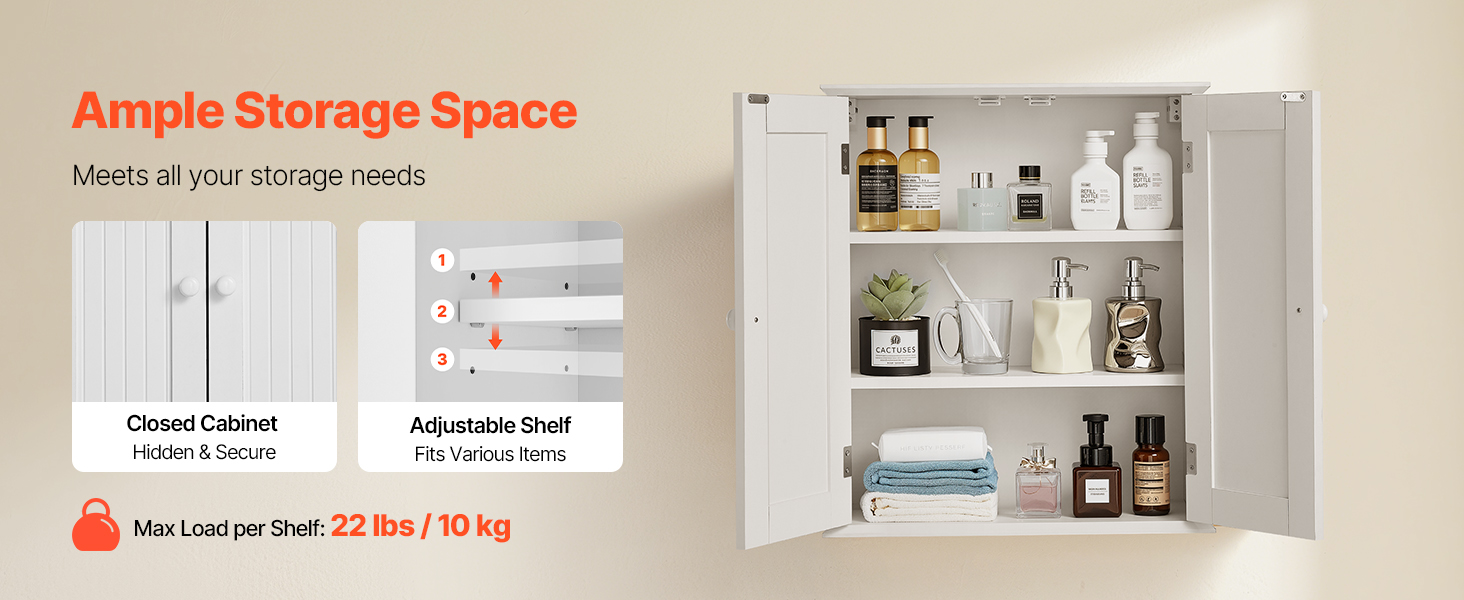 Uzavretá skrinka poskytuje skryté a bezpečné uloženie predmetov. Nastaviteľná polica závesnej kúpeľňovej skrinky sa dokáže flexibilne prispôsobiť rôznym typom predmetov a otvorená polica je prehľadná a krásna na prístup k predmetom dennej potreby. Je robustná a odolná.
