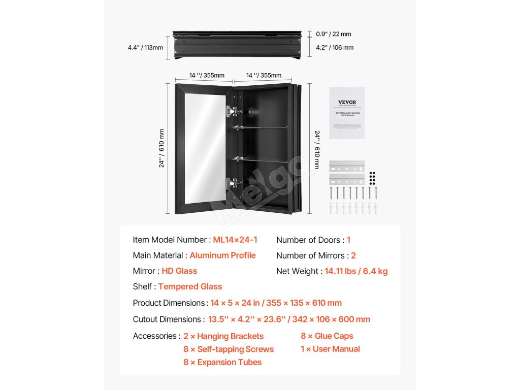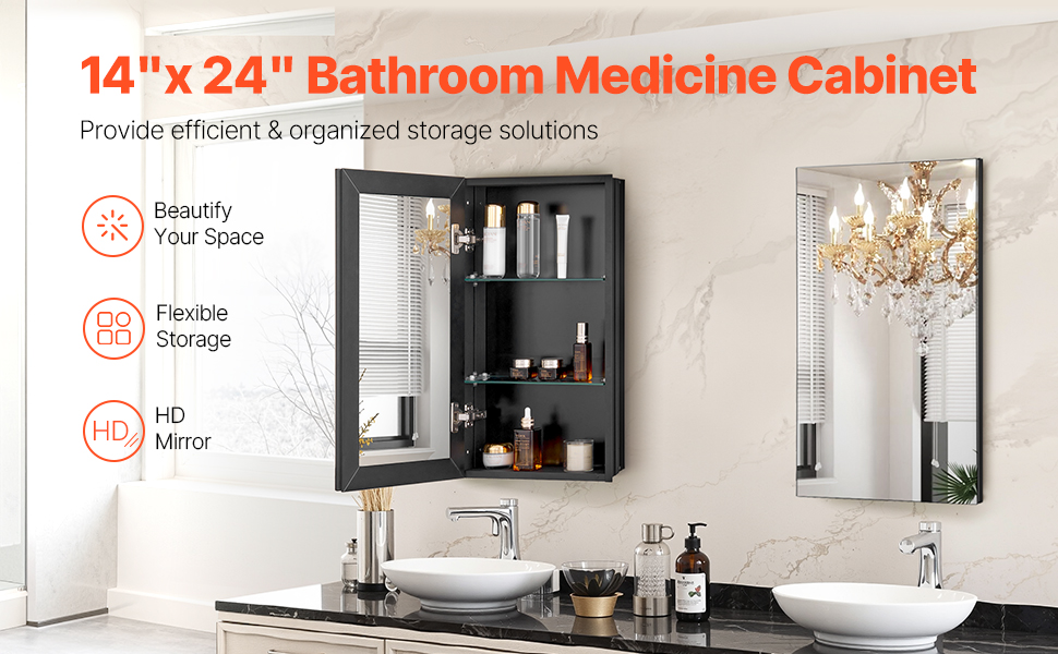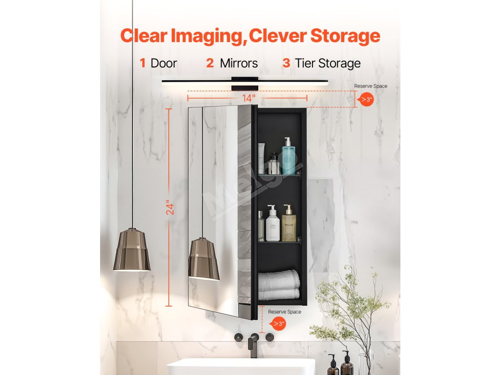 Kúpeľňová zrkadlová skrinka 14×24 inches, 2 police, zapustená/nástenná