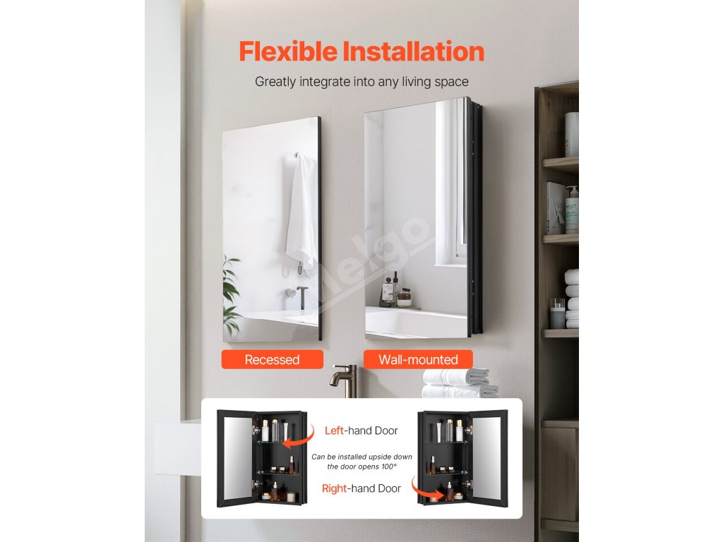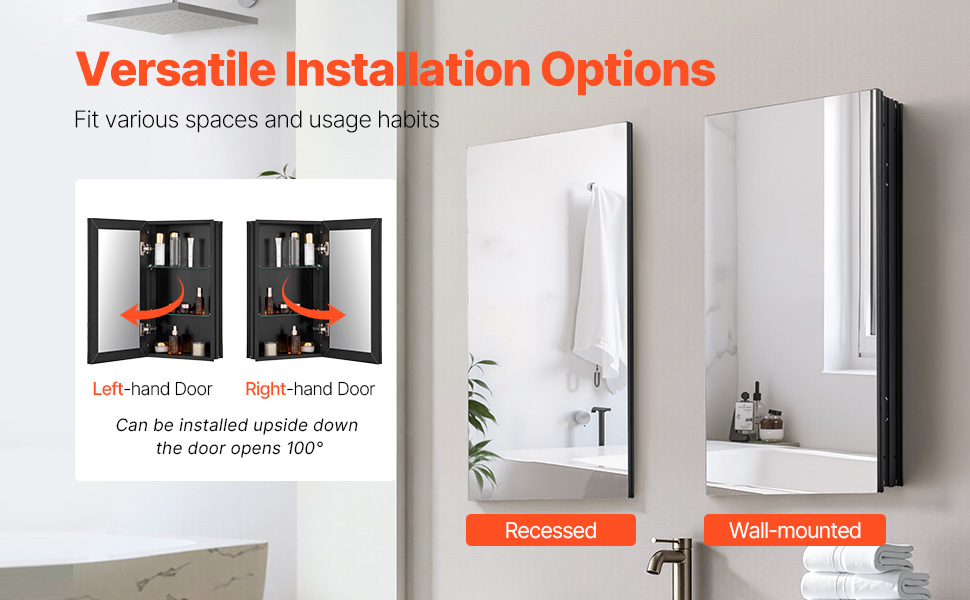 Kúpeľňová zrkadlová skrinka je určená na montáž na stenu aj na zapustenie a možno ju otočiť tak, aby sa prispôsobila ľavému alebo pravému otváraniu dverí. Bez námahy sa prispôsobí rôznym usporiadaniam kúpeľne a poskytuje väčšie pohodlie na základe vašich preferencií.