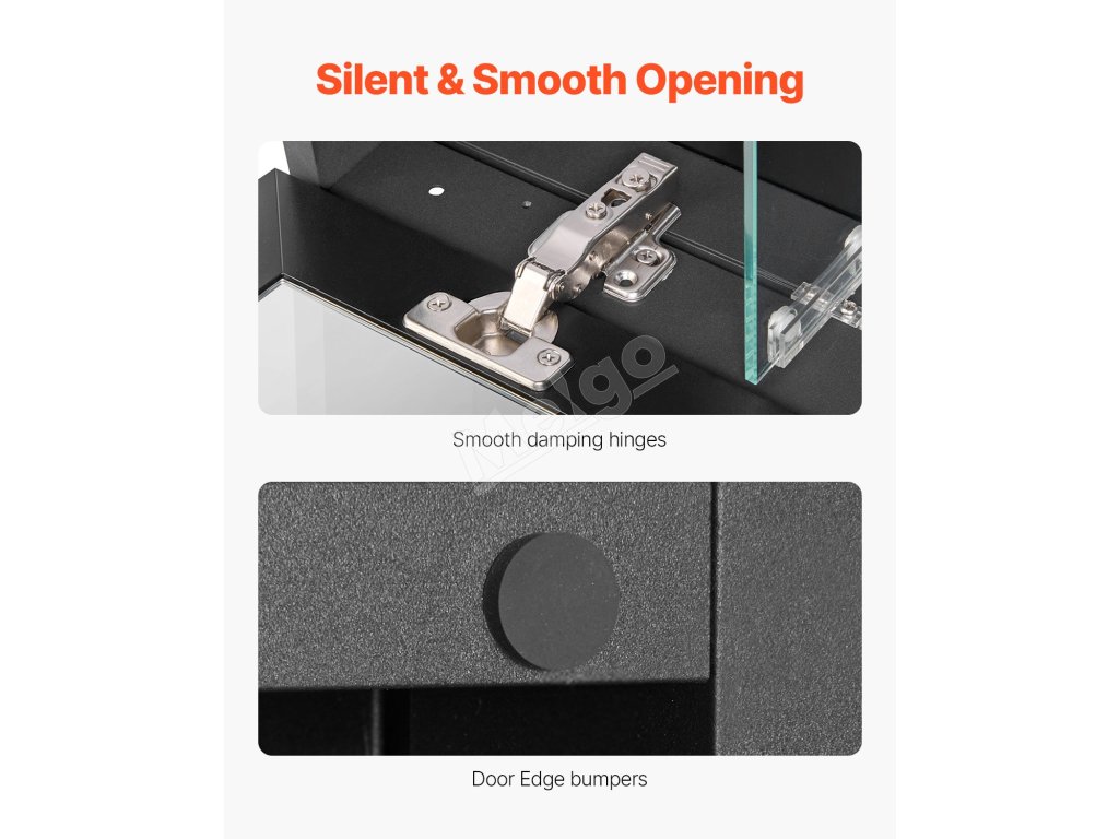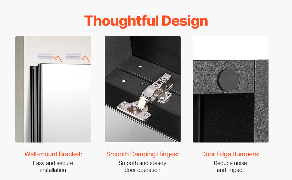 Nástenný držiak zjednodušuje inštaláciu a zároveň zvyšuje stabilitu. Lekárnička so zrkadlom je vybavená hladkými tlmenými závesmi pre tichý chod dvierok a prémiovými tlmiacimi podložkami, ktoré minimalizujú hluk a nárazy pri zatváraní.