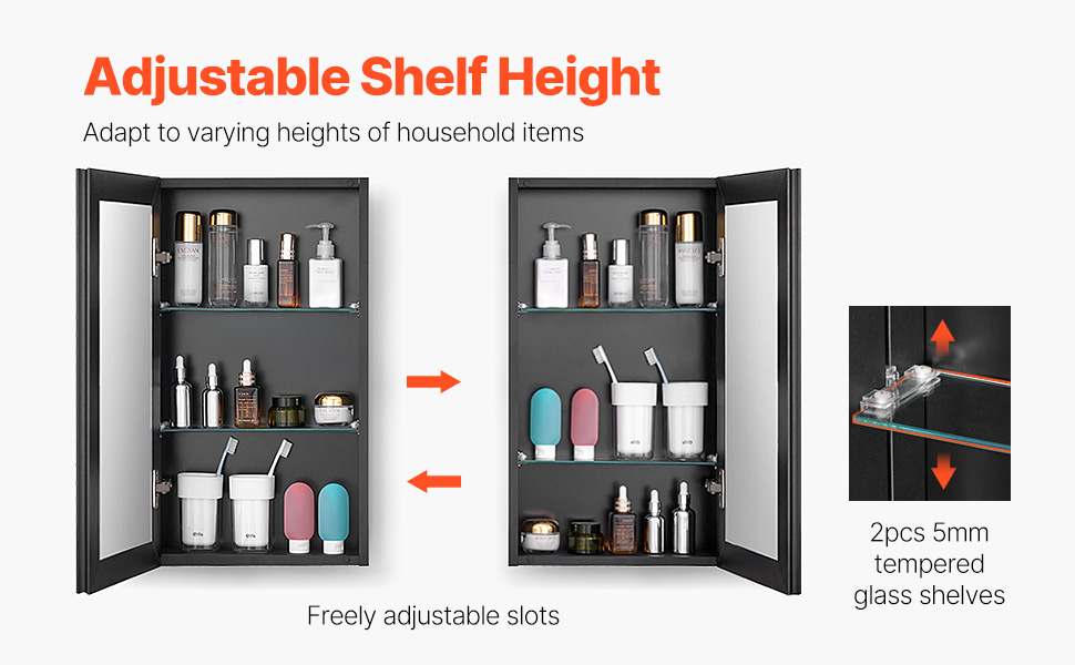 Poličky zrkadlovej lekárničky sa dajú ľahko nastaviť nahor a nadol, čím poskytujú personalizovaný úložný priestor pre predmety všetkých veľkostí - ideálne pre vysoké fľaše, malé kozmetické prípravky a všetko medzi tým.