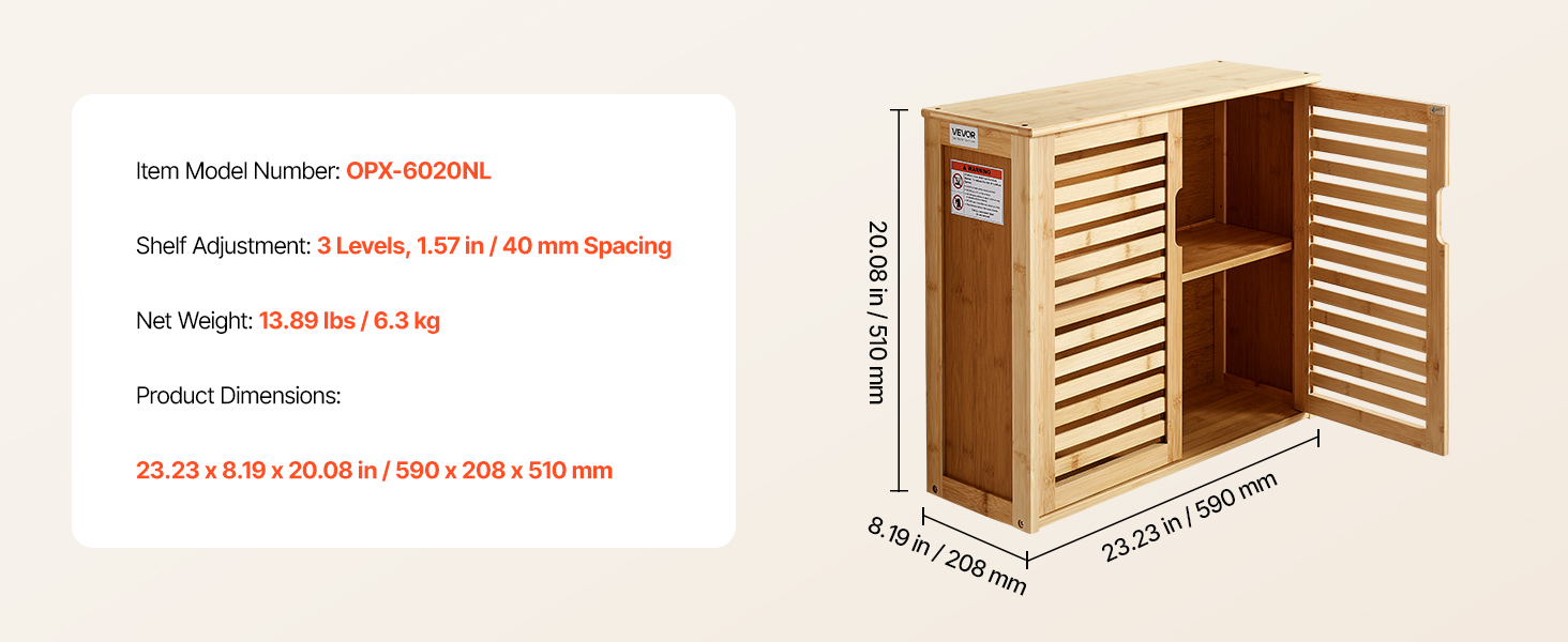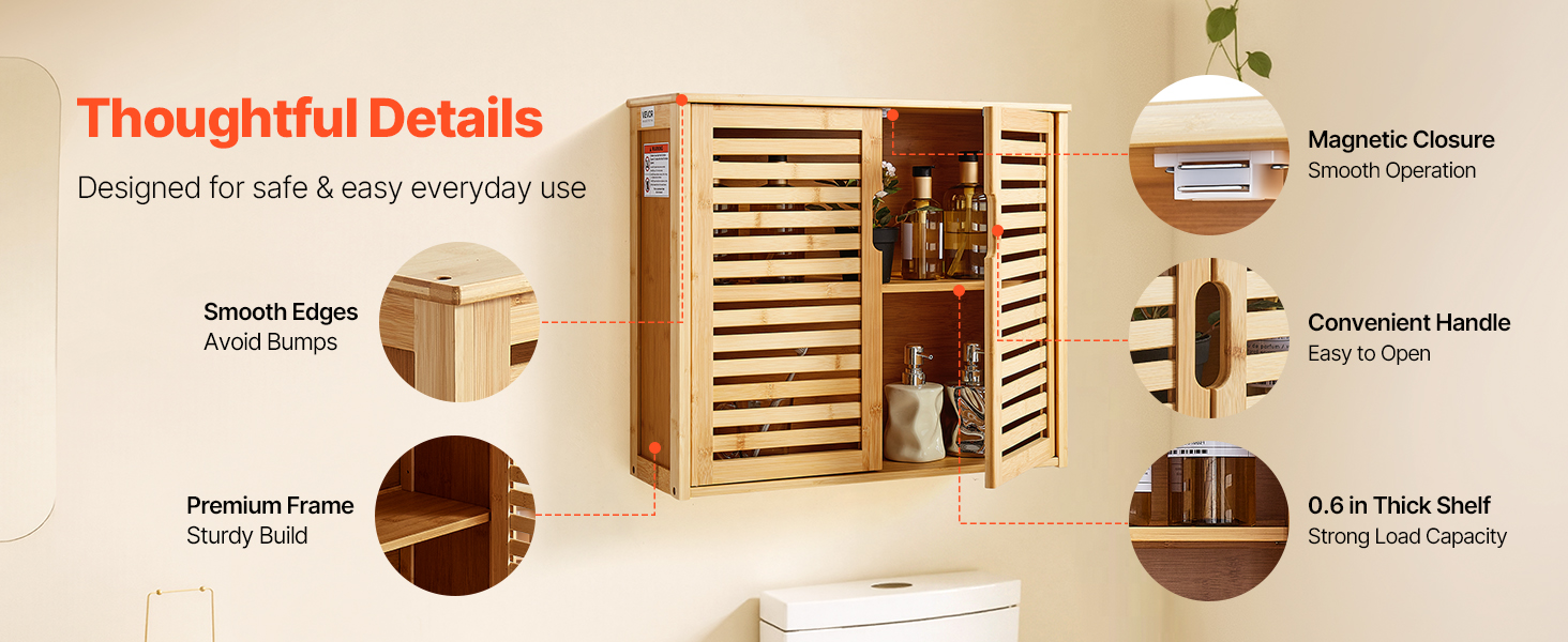 Naša závesná kúpeľňová skrinka má pevný a odolný rám s hladkým magnetickým zatváraním. Pohodlné úchyty a hladké hrany uľahčujú otváranie a zabraňujú nárazom. Polička s hrúbkou 0,6 palca poskytuje silnú nosnosť, zostáva dlhodobo pevná a atraktívna.