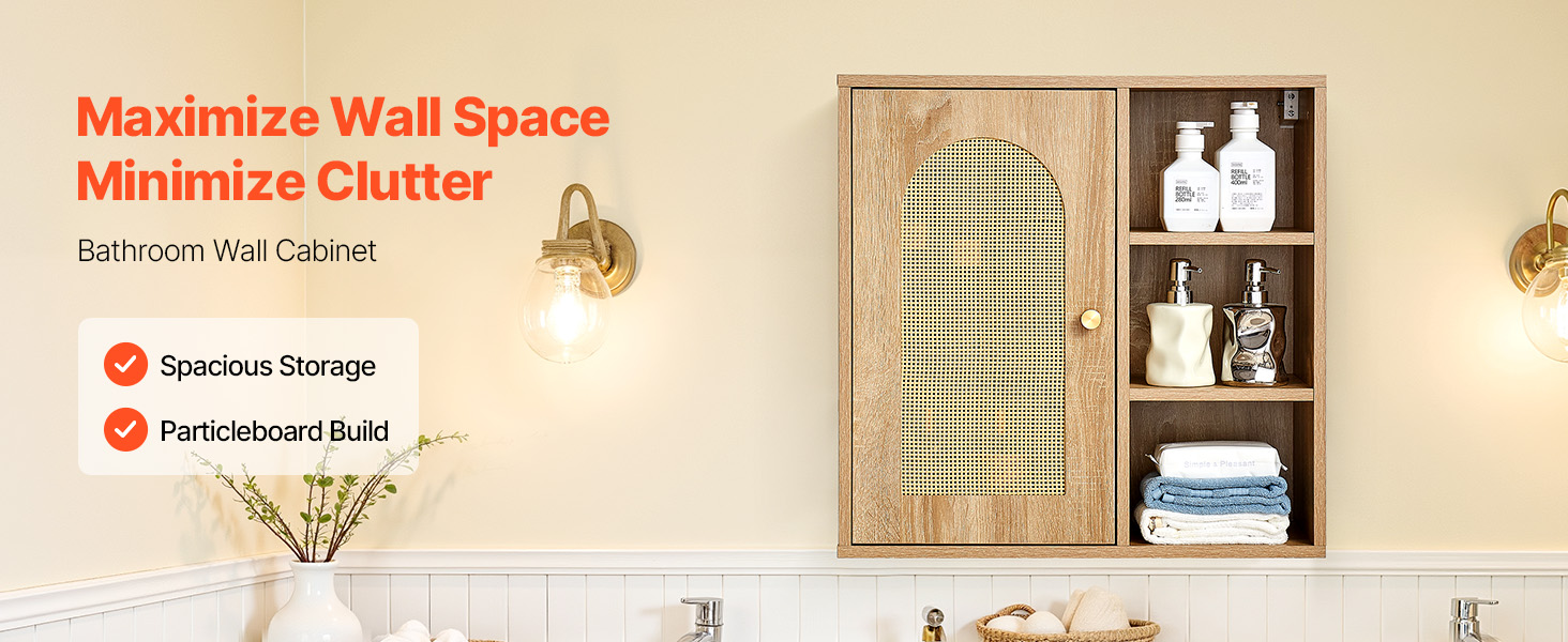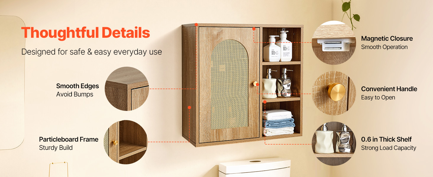 Naša závesná kúpeľňová skrinka má pevný a odolný rám z drevotrieskových dosiek s hladkým magnetickým zatváraním. Pohodlné úchyty a hladké hrany uľahčujú otváranie a zabraňujú nárazom. Polička s hrúbkou 0,6 palca poskytuje silnú nosnosť, zostáva dlhodobo pevná a atraktívna.