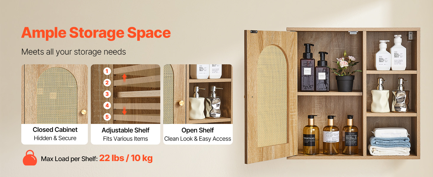 Uzavretá skrinka poskytuje skryté a bezpečné uloženie predmetov. Nastaviteľná polica závesnej kúpeľňovej skrinky sa dokáže flexibilne prispôsobiť rôznym typom predmetov a otvorená polica je prehľadná a krásna na prístup k predmetom dennej potreby. Je robustná a odolná.