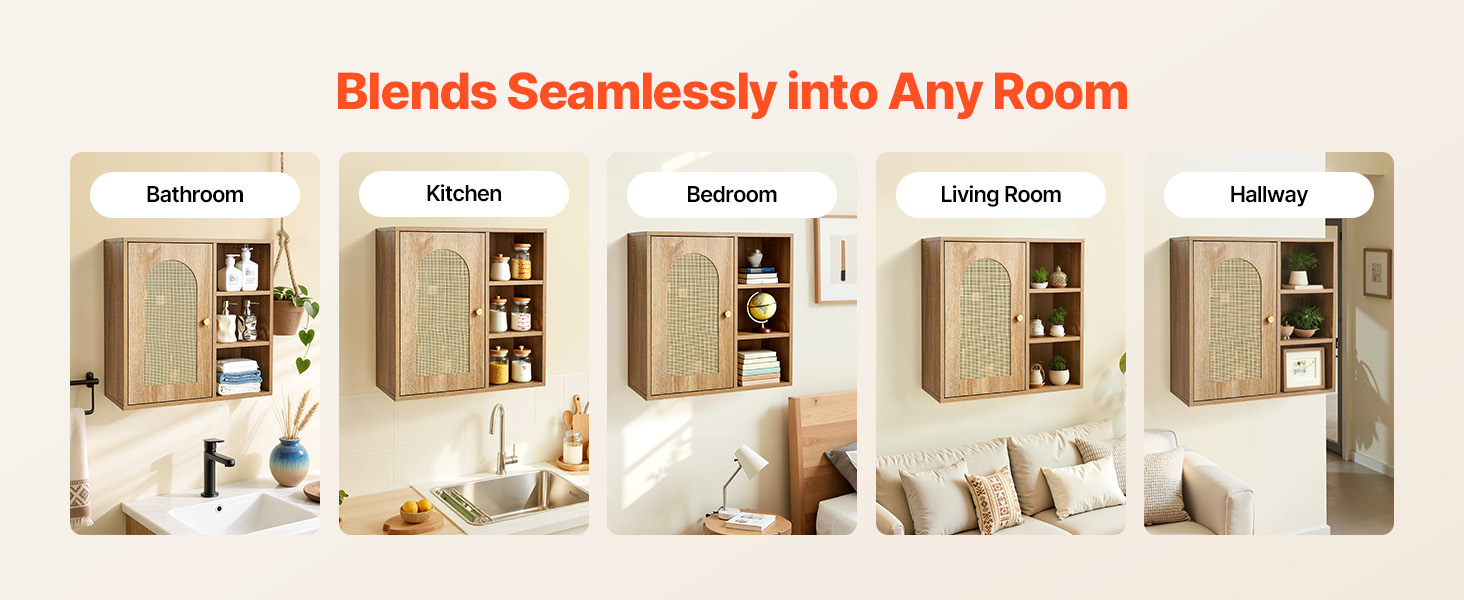 Táto multifunkčná kúpeľňová nástenná skrinka sa bez problémov začlení do kúpeľní, kuchýň, spální, obývacích izieb, chodieb a iných obytných priestorov. Flexibilne sa prispôsobí na ukladanie toaletných potrieb, kuchynských šanónov, organizovanie neporiadku v spálni alebo zdobenie stien obývacej izby.