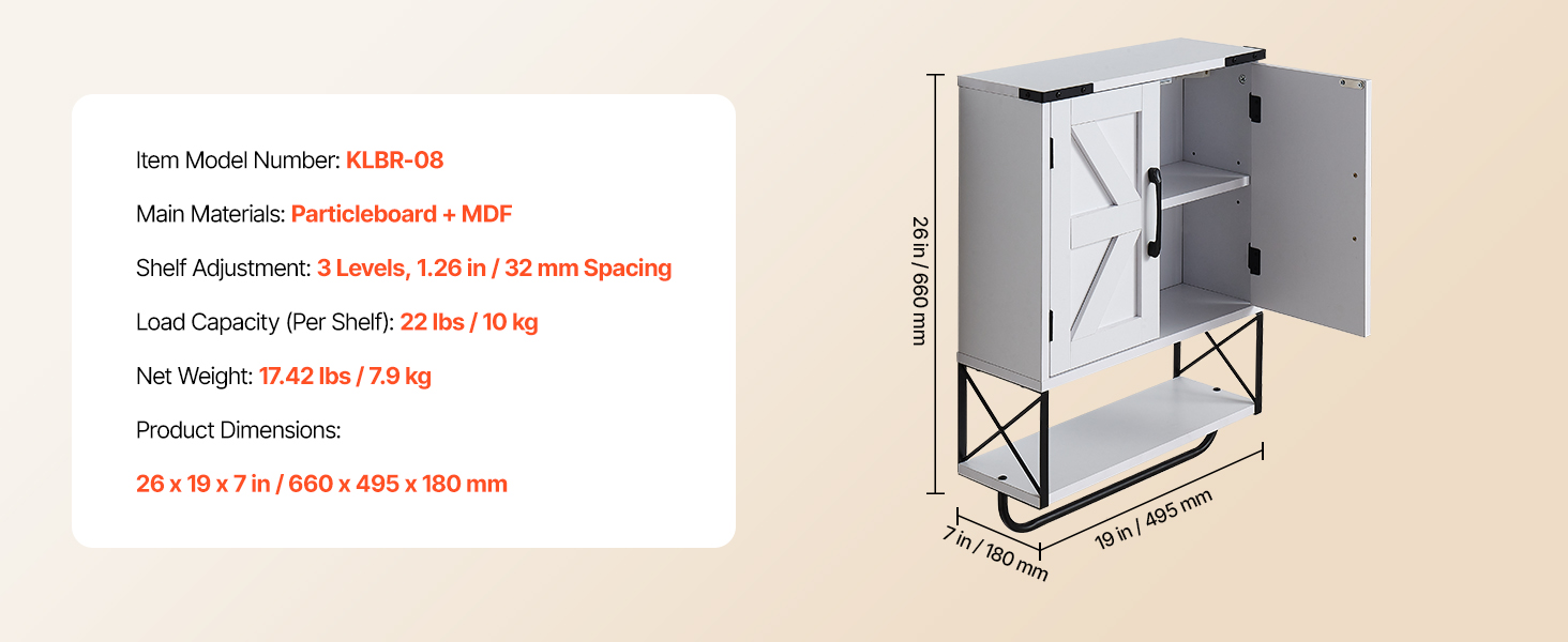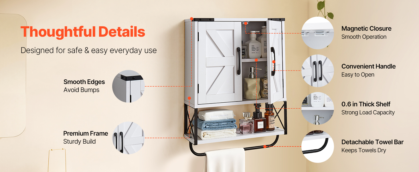 Naša závesná kúpeľňová skrinka má pevný a odolný rám z drevotrieskových dosiek s hladkým magnetickým zatváraním. Pohodlné úchyty a hladké hrany uľahčujú otváranie a zabraňujú nárazom. Odnímateľná tyč na uteráky udržiava čistotu s praktickosťou a ľudskosťou.