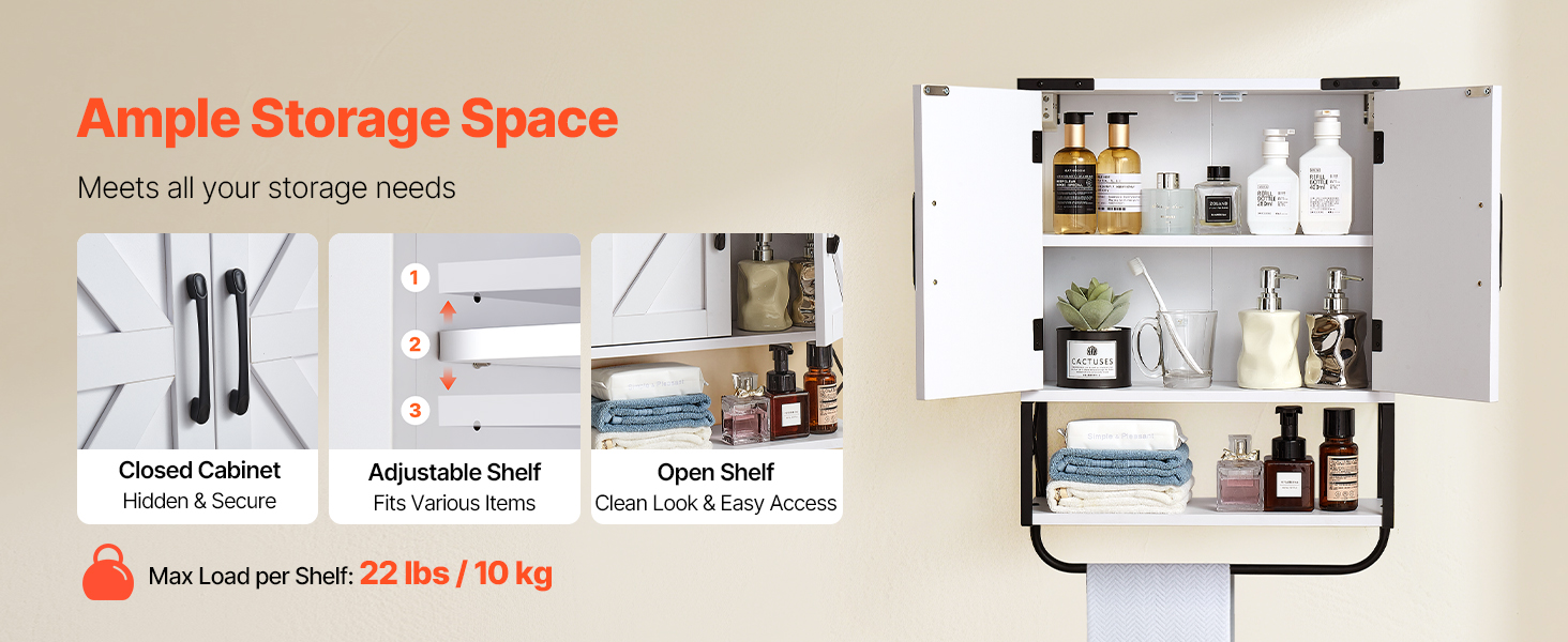 Uzavretá skrinka poskytuje skryté a bezpečné uloženie predmetov. Nastaviteľná polica závesnej kúpeľňovej skrinky sa dokáže flexibilne prispôsobiť rôznym typom predmetov a otvorená polica je prehľadná a krásna na prístup k predmetom dennej potreby. Je robustná a odolná.