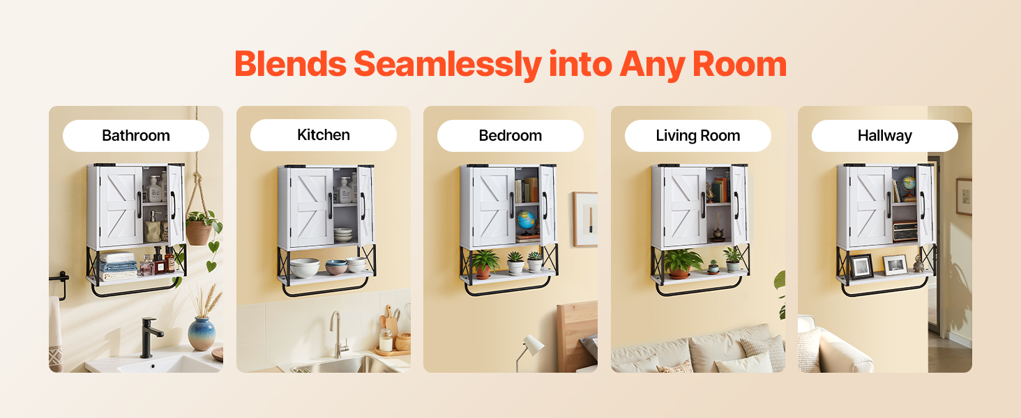 Táto multifunkčná kúpeľňová nástenná skrinka sa bez problémov začlení do kúpeľní, kuchýň, spální, obývacích izieb, chodieb a iných obytných priestorov. Flexibilne sa prispôsobí na ukladanie toaletných potrieb, kuchynských šanónov, organizovanie neporiadku v spálni alebo zdobenie stien obývacej izby.