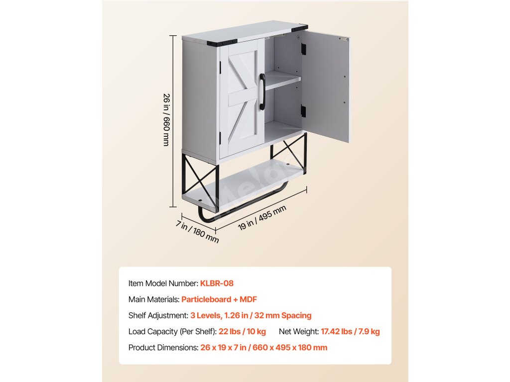 Naša závesná kúpeľňová skrinka má pevný a odolný rám z drevotrieskových dosiek s hladkým magnetickým zatváraním. Pohodlné úchyty a hladké hrany uľahčujú otváranie a zabraňujú nárazom. Odnímateľná tyč na uteráky udržiava čistotu s praktickosťou a ľudskosťou.