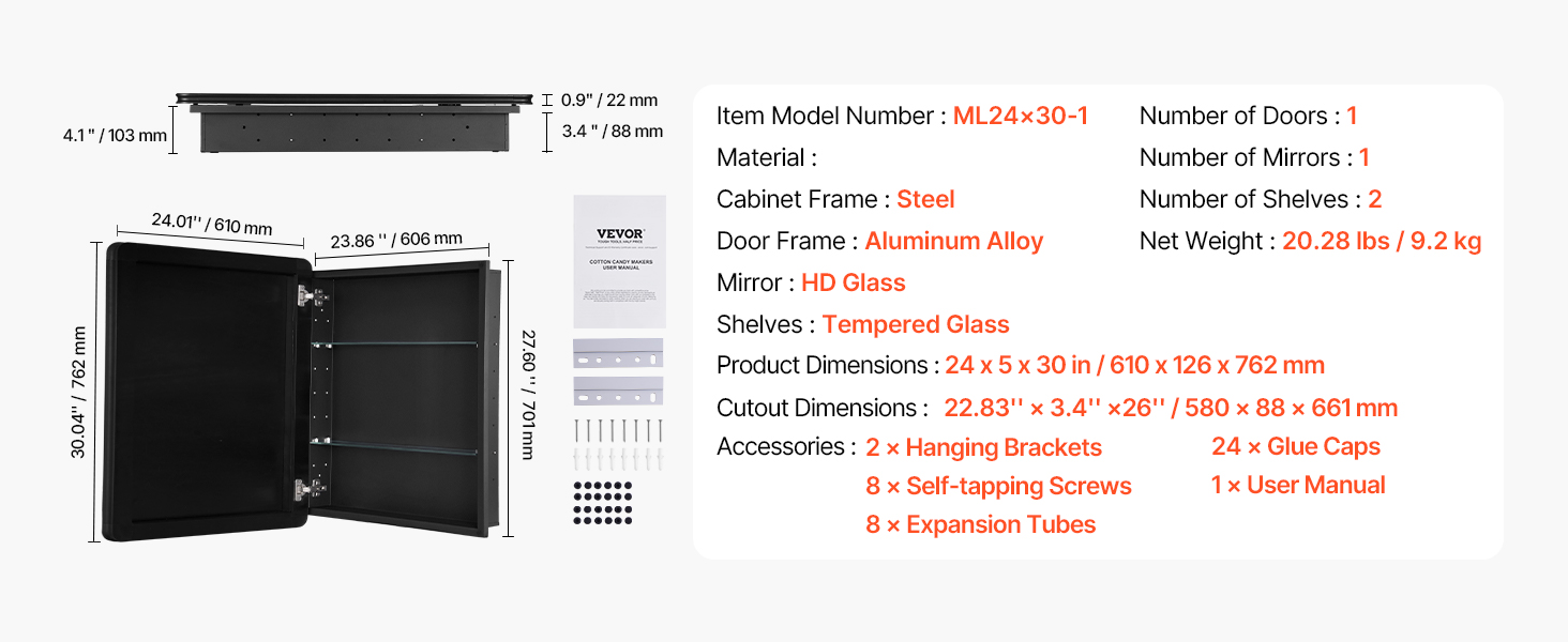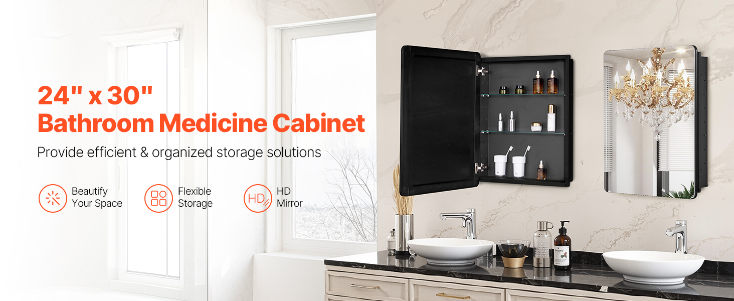 Zrkadlová skrinka 24×30 inch, hliník, 2 nastaviteľné police