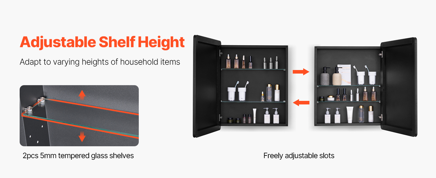 Poličky zrkadlovej lekárničky sa dajú ľahko nastaviť nahor a nadol, čím poskytujú personalizovaný úložný priestor pre predmety všetkých veľkostí - ideálne pre vysoké fľaše, malú kozmetiku a všetko medzi tým.