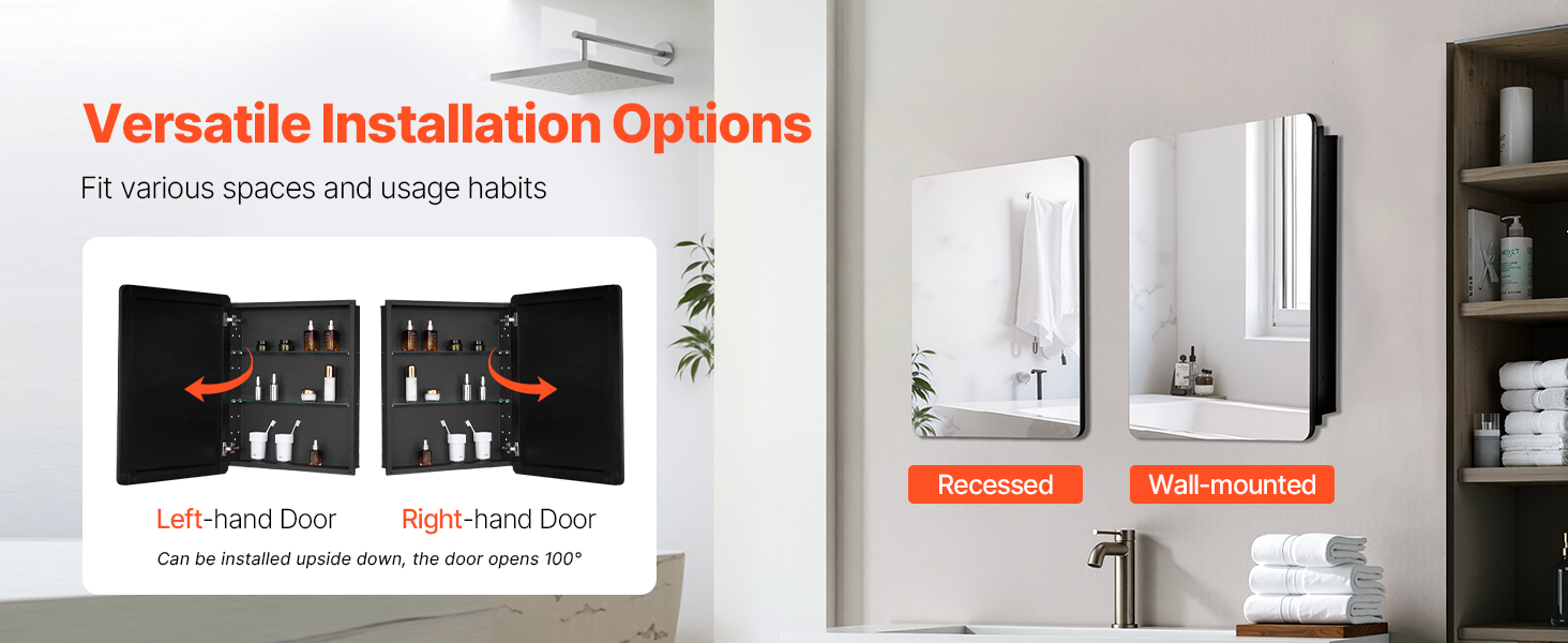 Kúpeľňová zrkadlová skrinka je určená na montáž na stenu aj na zapustenie a možno ju otočiť tak, aby sa prispôsobila ľavému alebo pravému otváraniu dverí. Bez námahy sa prispôsobí rôznym usporiadaniam kúpeľne a poskytuje väčšie pohodlie na základe vašich preferencií.
