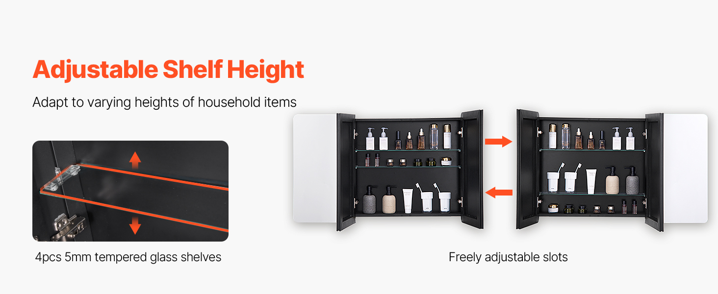 Poličky zrkadlovej lekárničky sa dajú ľahko nastaviť nahor a nadol, čím poskytujú personalizovaný úložný priestor pre predmety všetkých veľkostí - ideálne pre vysoké fľaše, malú kozmetiku a všetko medzi tým.