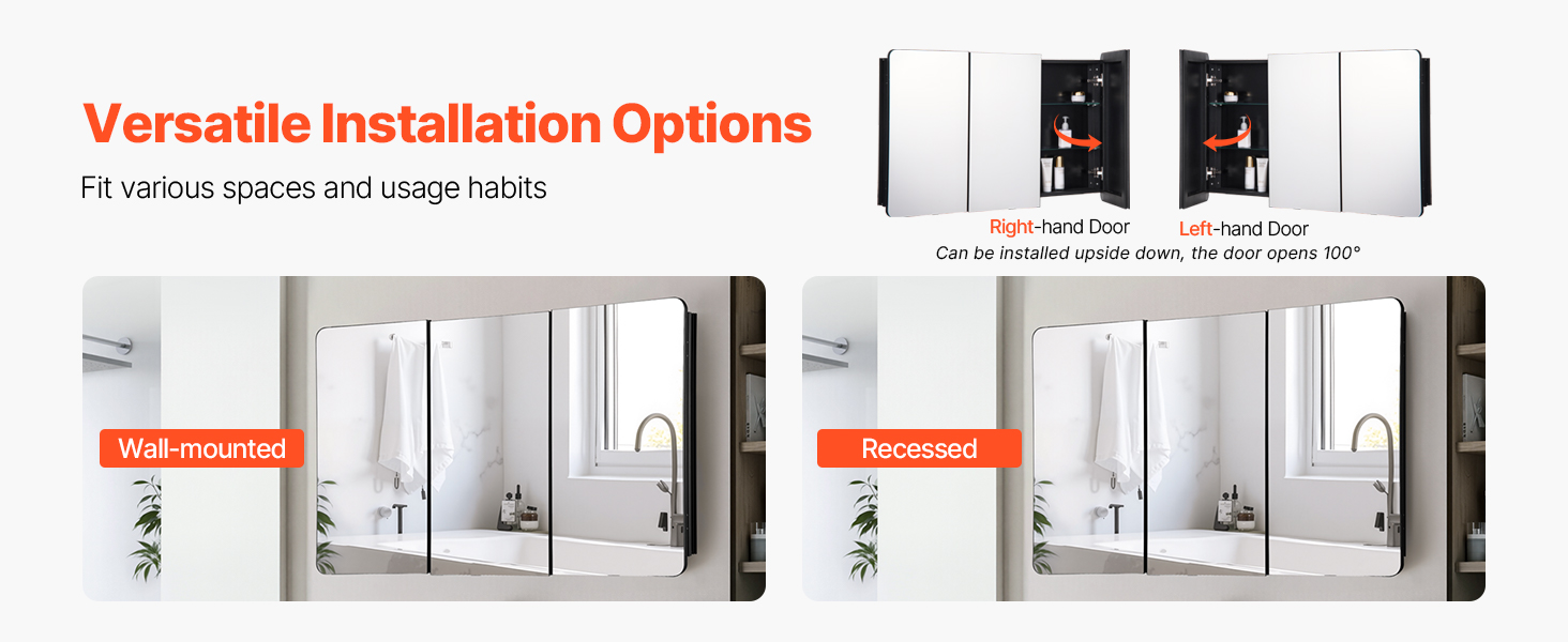 Kúpeľňová zrkadlová skrinka je určená na montáž na stenu aj na zapustenie a možno ju otočiť tak, aby sa prispôsobila ľavému alebo pravému otváraniu dverí. Bez námahy sa prispôsobí rôznym usporiadaniam kúpeľne a poskytuje väčšie pohodlie na základe vašich preferencií.