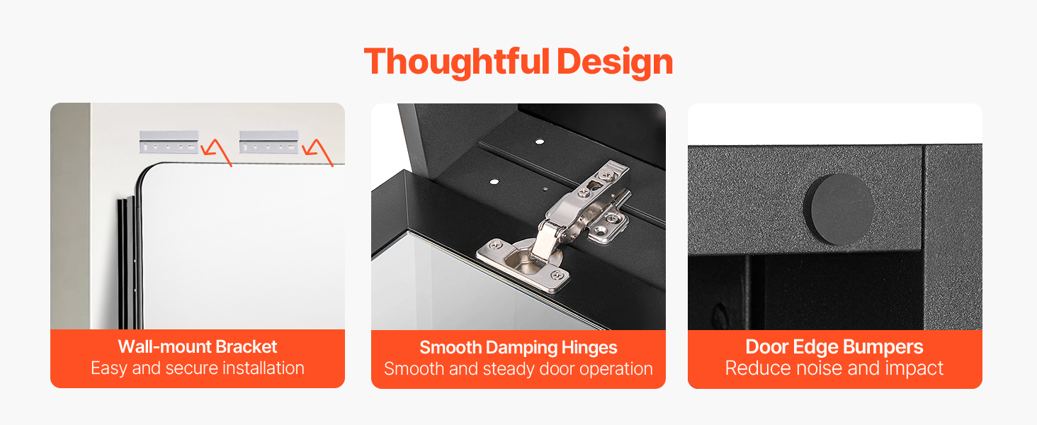Nástenný držiak zjednodušuje inštaláciu a zároveň zvyšuje stabilitu. Lekárnička so zrkadlom je vybavená hladkými tlmenými závesmi pre tichý chod dvierok a prémiovými tlmiacimi podložkami, ktoré minimalizujú hluk a nárazy pri zatváraní.