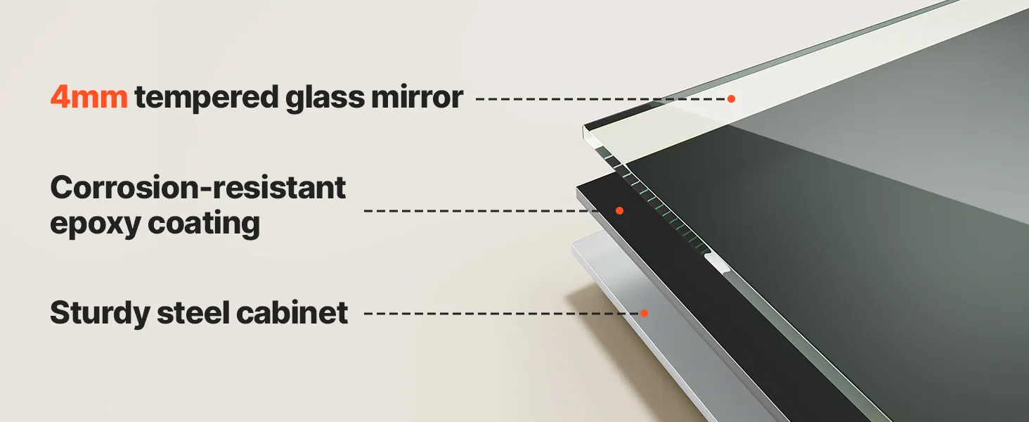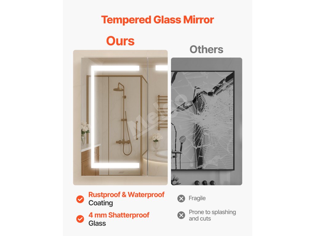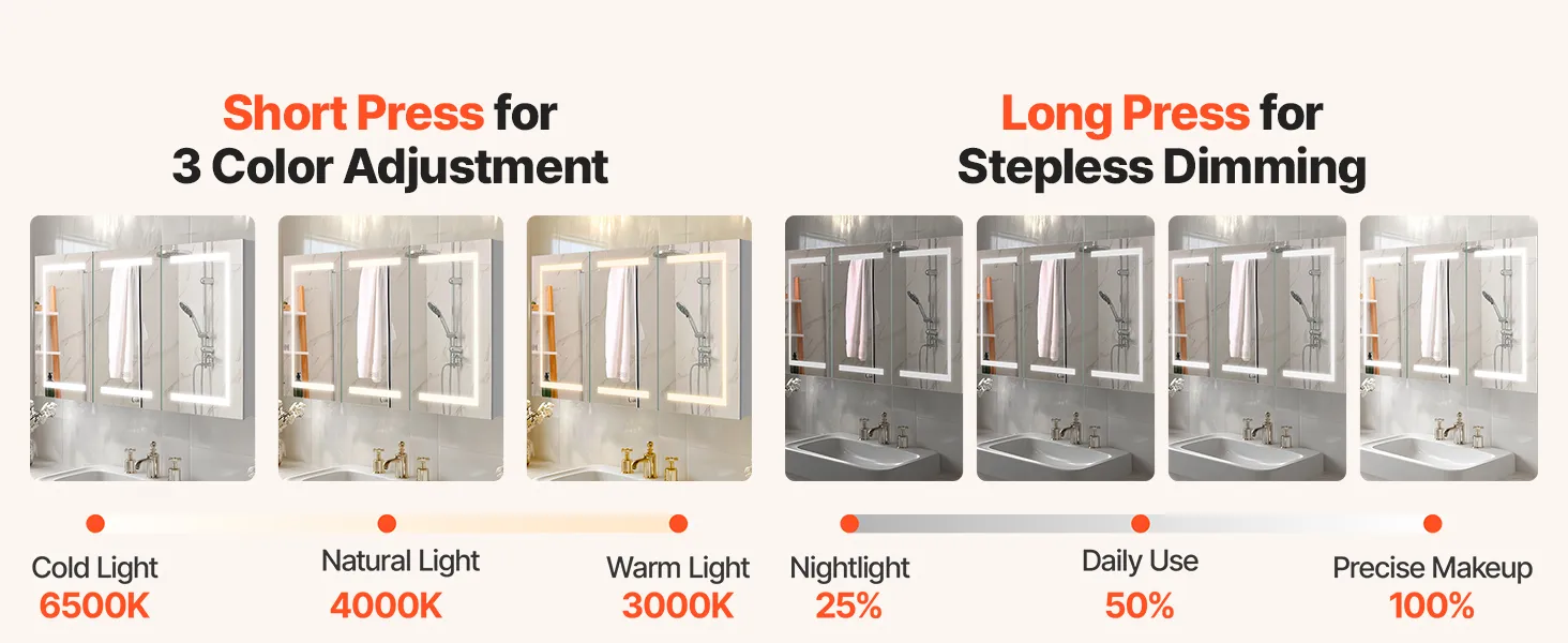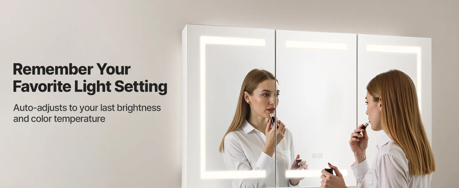 Táto LED zrkadlová skrinka ponúka vysoko svietivé svetlo na líčenie a nízko svietivé teplé svetlo na jemné umývanie v noci. Pamäťová funkcia automaticky vyvolá posledné nastavenie jasu. Spĺňa vaše potreby osvetlenia v rôznych denných dobách