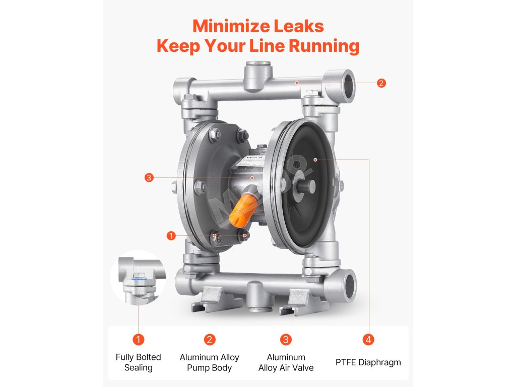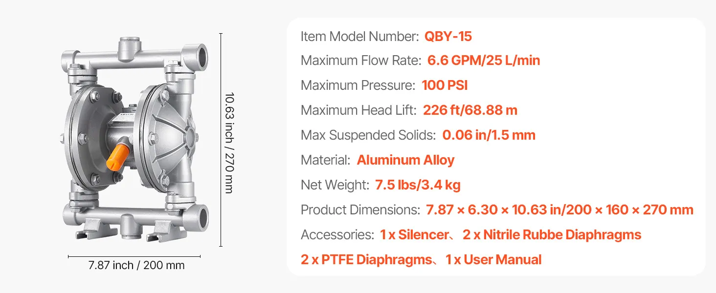 S membránami z PTFE a plne priskrutkovanou konštrukciou pre bezpečné utesnenie a dlhodobú spoľahlivosť. Vďaka maximálnemu prietoku 6,6 GPM, maximálnemu zdvihu 226 ft a štandardnej veľkosti portu účinne prečerpáva odpadový olej, nie je vhodné pre korozívne kyseliny/alkálie alebo kvapaliny s teplotou nad 140℉/60 ℃.