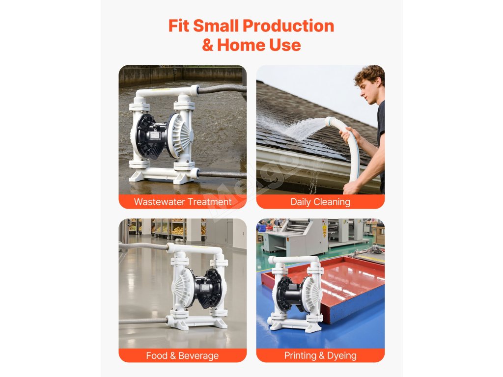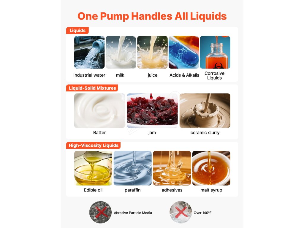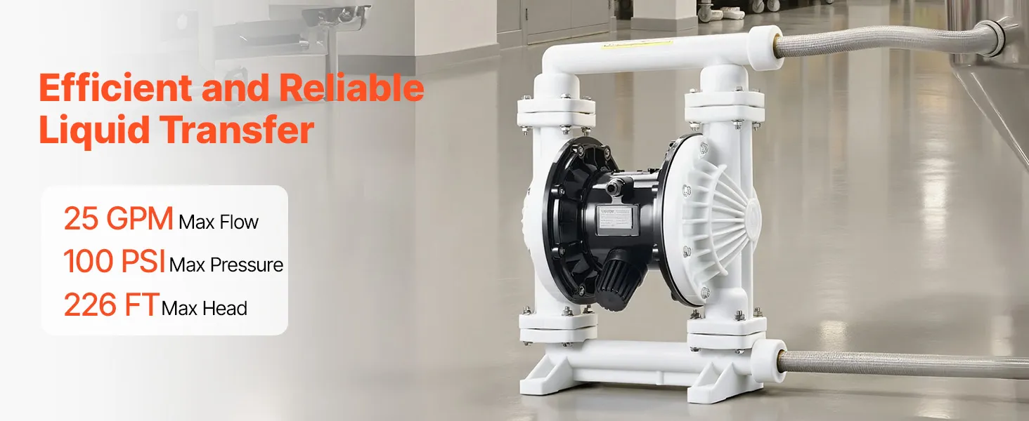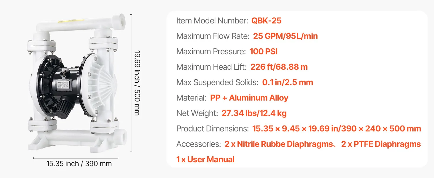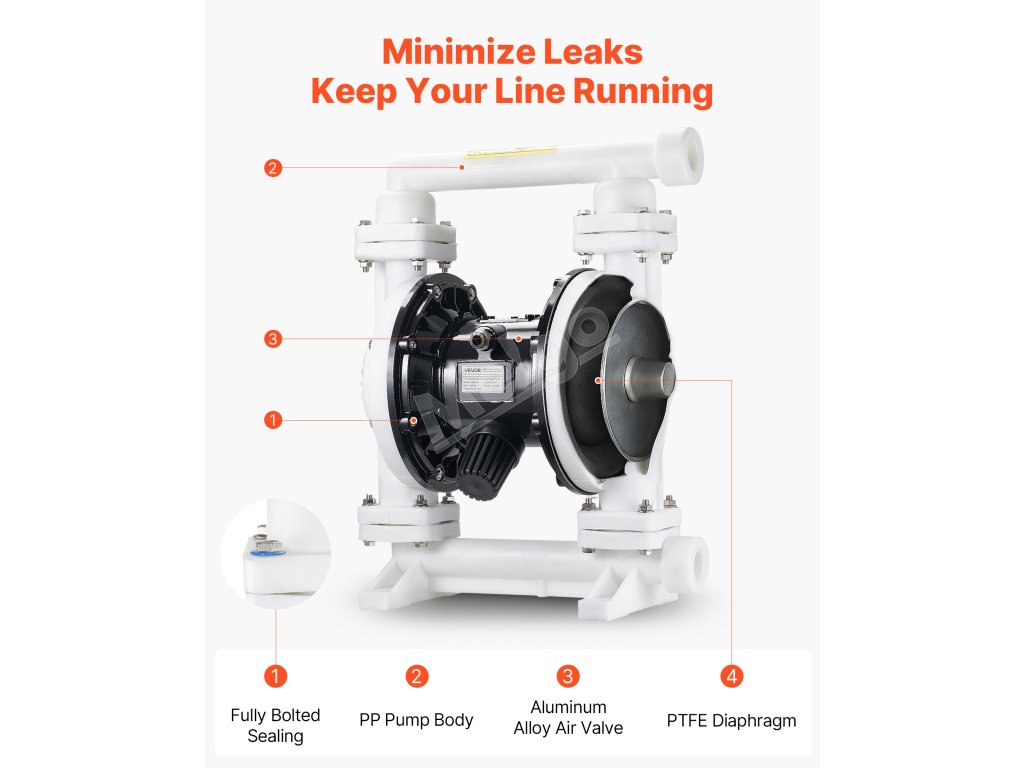 S membránami z PTFE a celošroubovou konštrukciou pre bezpečné utesnenie a dlhodobú spoľahlivosť. Vďaka maximálnemu prietoku 25 GPM, maximálnemu zdvihu 226 ft a štandardnej veľkosti portu ľahko prečerpáva odpadový olej a rôzne kyslé alebo alkalické kvapaliny, nie je vhodné pre abrazívne médiá alebo kvapaliny s teplotou nad 140℉/60 ℃.