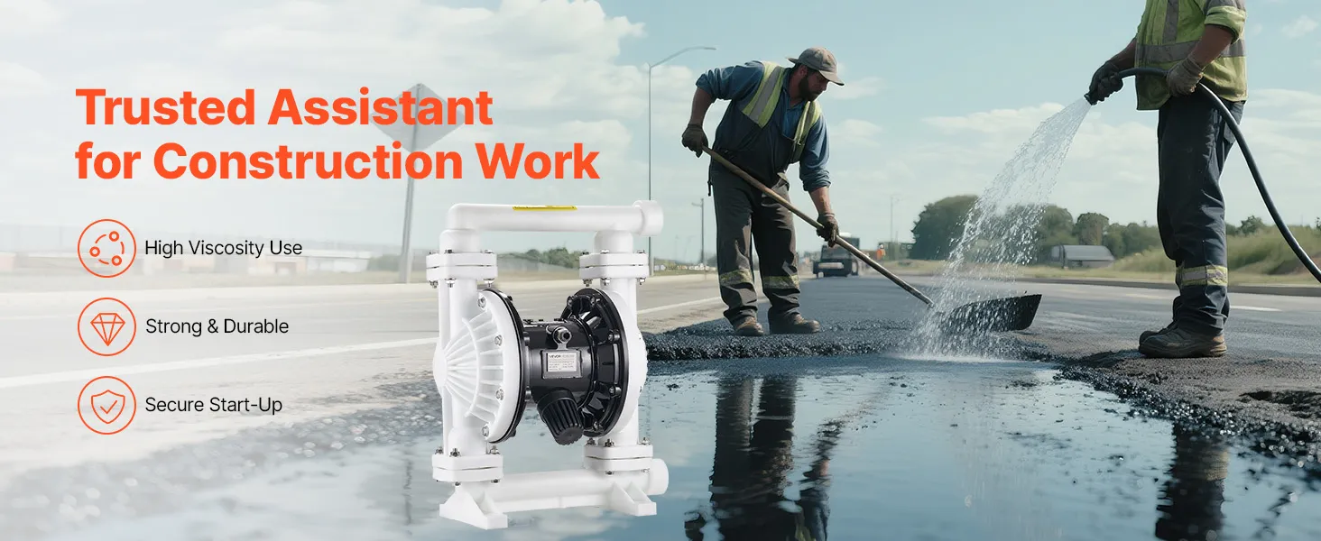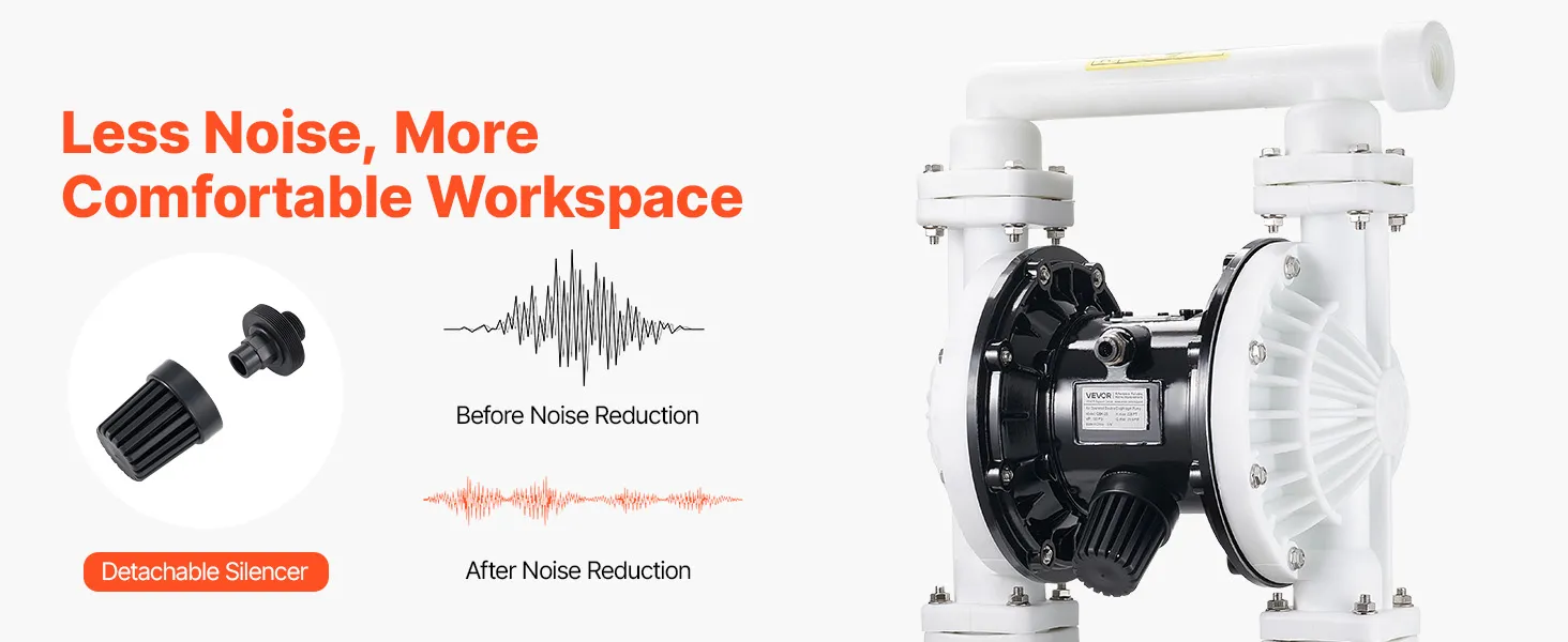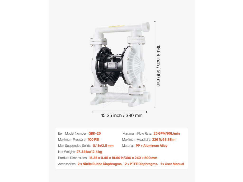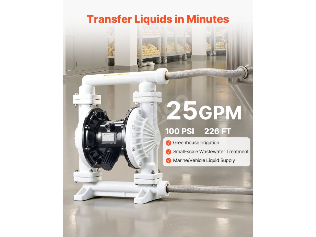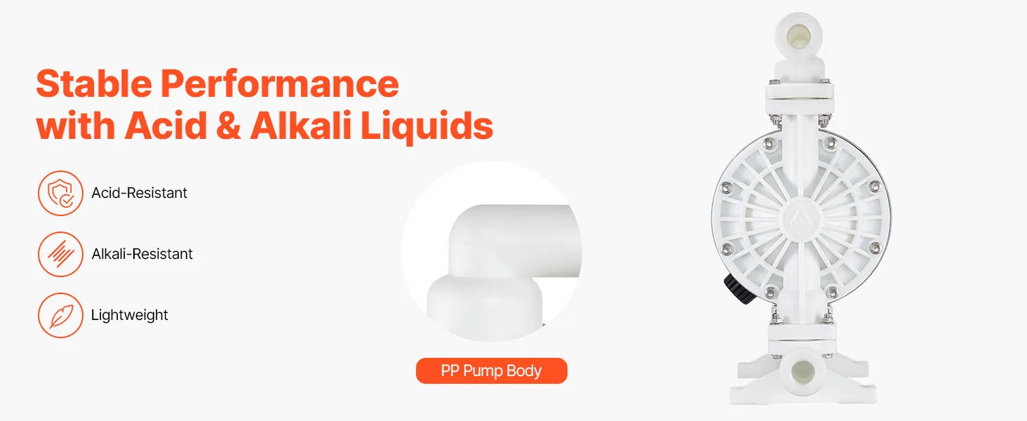 S membránami z PTFE a celošroubovou konštrukciou pre bezpečné utesnenie a dlhodobú spoľahlivosť. Vďaka maximálnemu prietoku 25 GPM, maximálnemu zdvihu 226 ft a štandardnej veľkosti portu ľahko prečerpáva odpadový olej a rôzne kyslé alebo alkalické kvapaliny, nie je vhodné pre abrazívne médiá alebo kvapaliny s teplotou nad 140℉/60 ℃.