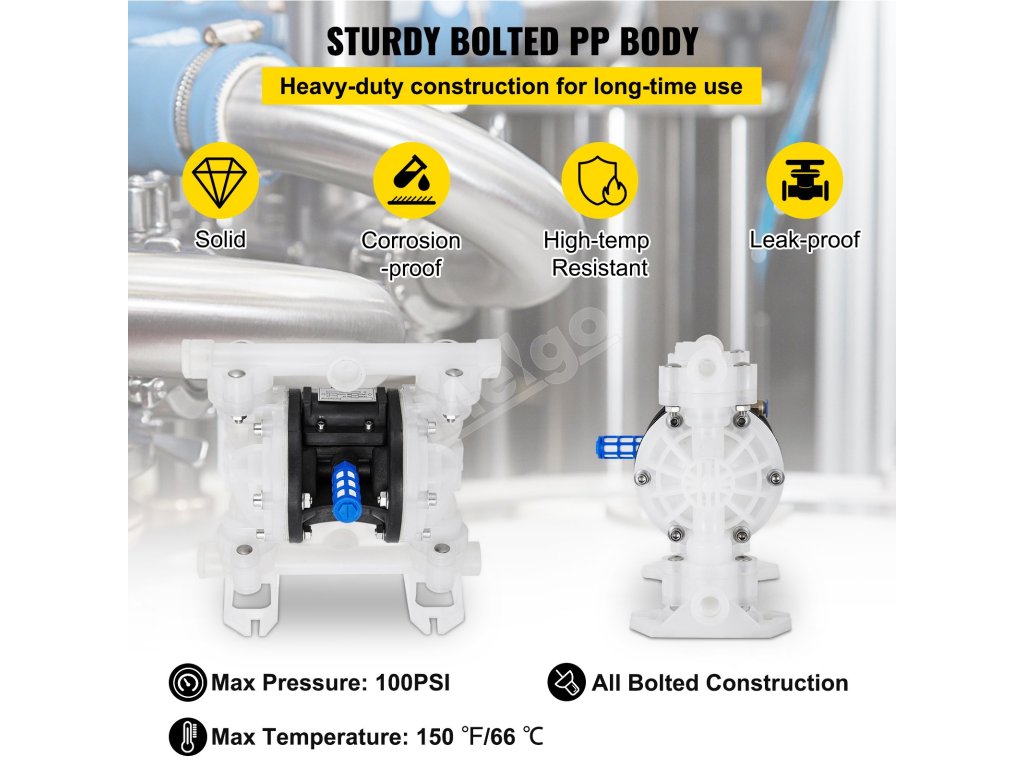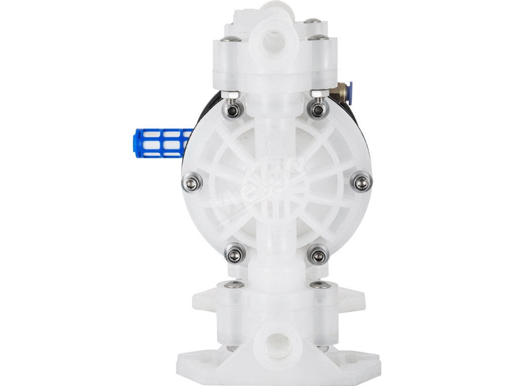 Plášť vzduchom poháňaného membránového čerpadla má polypropylénovú konštrukciu, je celý priskrutkovaný, pevný a odolný proti korózii. Max. Teplota: max: 150 ℉/66 ℃; Max. Tlak: 100 psi.