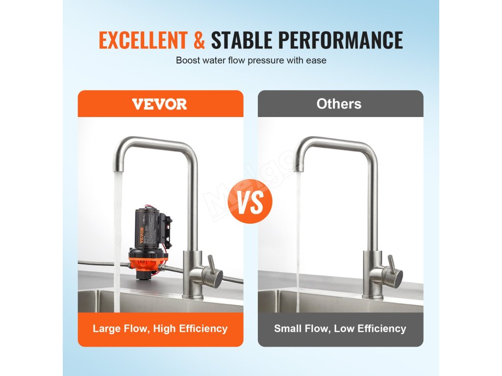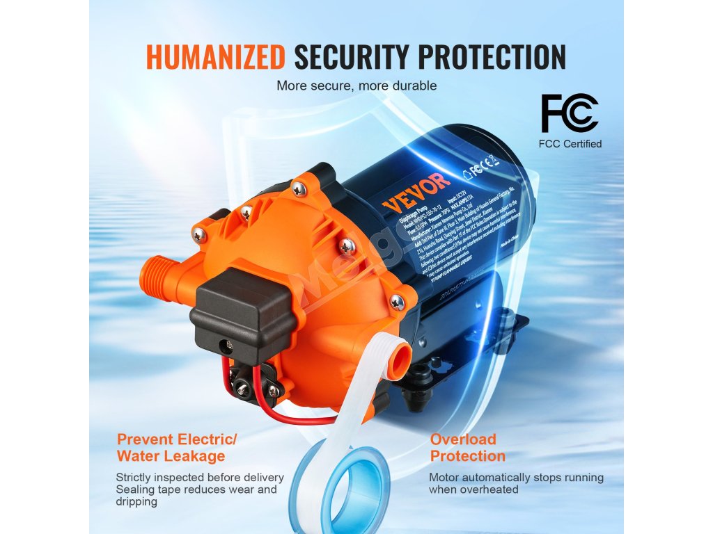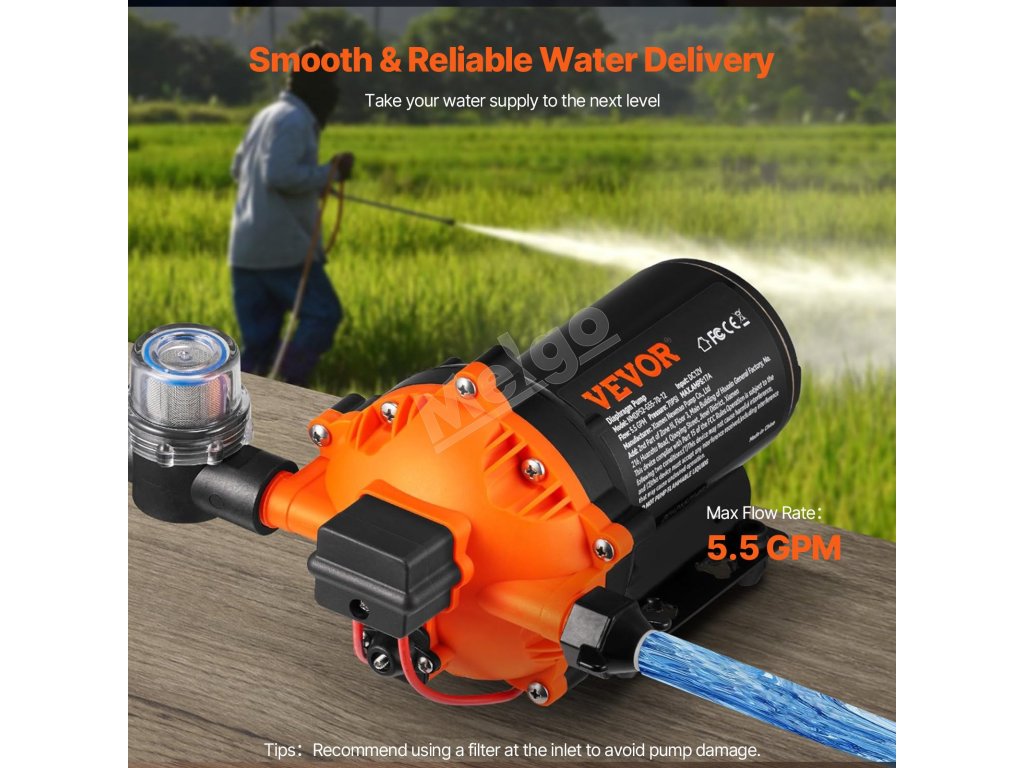 Zlepšite si tlak vody pomocou tohto 12V tlakového čerpadla na vodu. Toto čerpadlo s tlakom 70 PSI poskytuje konštantnú vodu s rýchlosťou 5,5 galónov za minútu. Je spoľahlivým riešením pre všetky vaše potreby týkajúce sa tlaku vody. Dokáže sa samostatne spustiť až do 6 stôp, čím šetrí námahu a čas. Toto čerpadlo je skonštruované pevne a funguje efektívne. Má automatické zapínanie/vypínanie a bezpečnostné funkcie na jednoduché používanie. Skvele sa hodí na zalievanie rastlín, umývanie áut a ďalšie účely s ochranou proti preťaženiu a tichou prevádzkou. Je to všestranný a nevyhnutný nástroj pre domácnosti aj podniky.