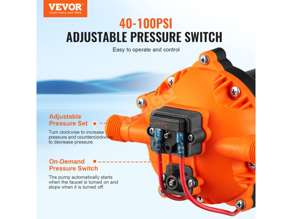 Toto membránové čerpadlo s tlakom vody má silný motor (17 A), ktorý udržiava stabilný tlak vody aj pri použití veľkého množstva vody naraz. Tlak začína na hodnote 70 libier na štvorcový palec (PSI), ale môžete ho ľahko nastaviť v rozmedzí 40 až 100 PSI v závislosti od vašej potreby. Pre ešte jednoduchšie používanie má toto čerpadlo s prietokom 5,5 g/min špeciálny spínač, ktorý ho automaticky zapína a vypína spolu s batériou. Vďaka tejto používateľsky prívetivej funkcii je obsluha tohto membránového čerpadla jednoduchá.