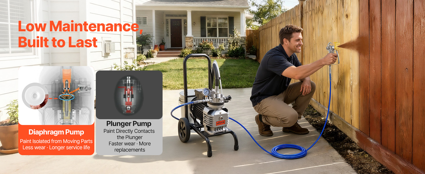 Tento bezvzduchový striekací stroj s vozíkom je vybavený chránenou konštrukciou čerpadla, ktorá znižuje opotrebenie a zaisťuje dlhodobú spoľahlivosť bez potreby častých opráv alebo výmeny dielov.