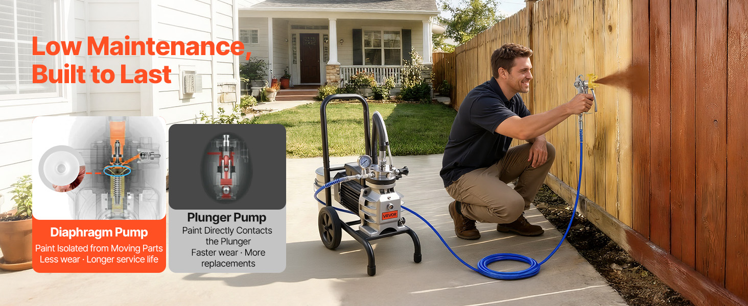 Tento bezvzduchový striekací stroj s vozíkom je vybavený chránenou konštrukciou čerpadla, ktorá znižuje opotrebenie a zaisťuje dlhodobú spoľahlivosť bez potreby častých opráv alebo výmeny dielov.