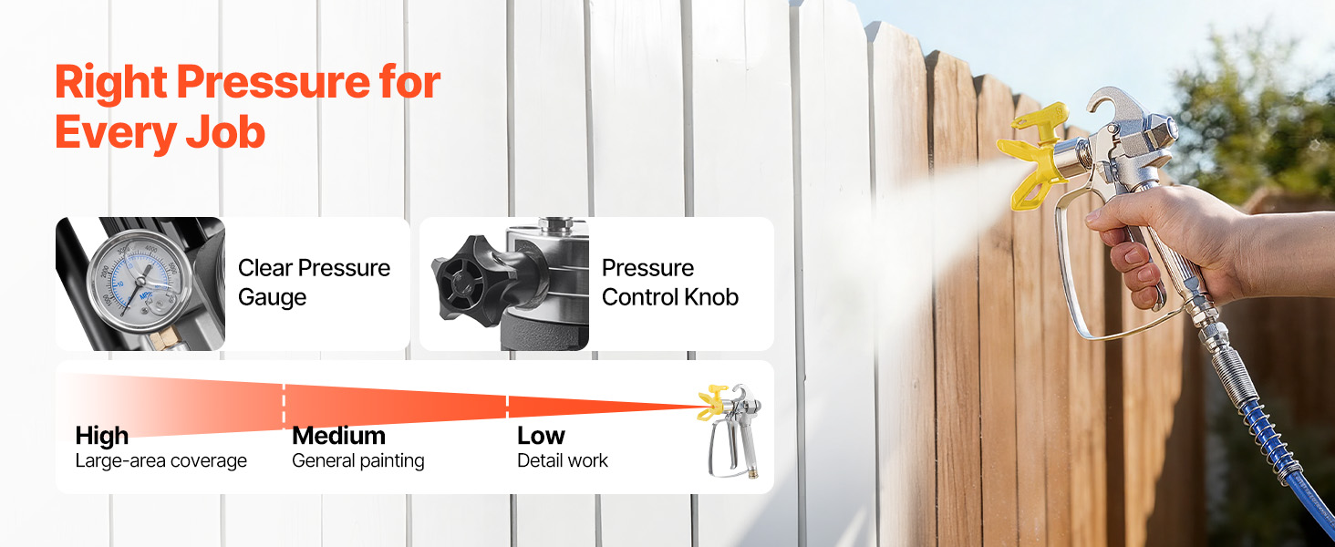 Presné ovládanie tlaku pomáha udržiavať rovnomerné a konzistentné pokrytie. Tento komerčný striekací stroj na farbu poskytuje spoľahlivé výsledky pri širokej škále maliarskych projektov.